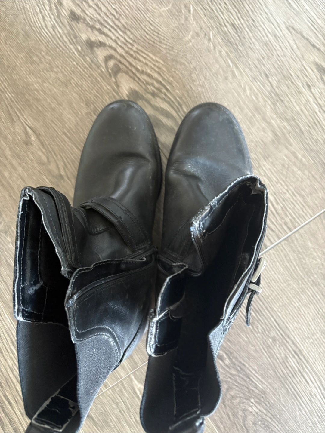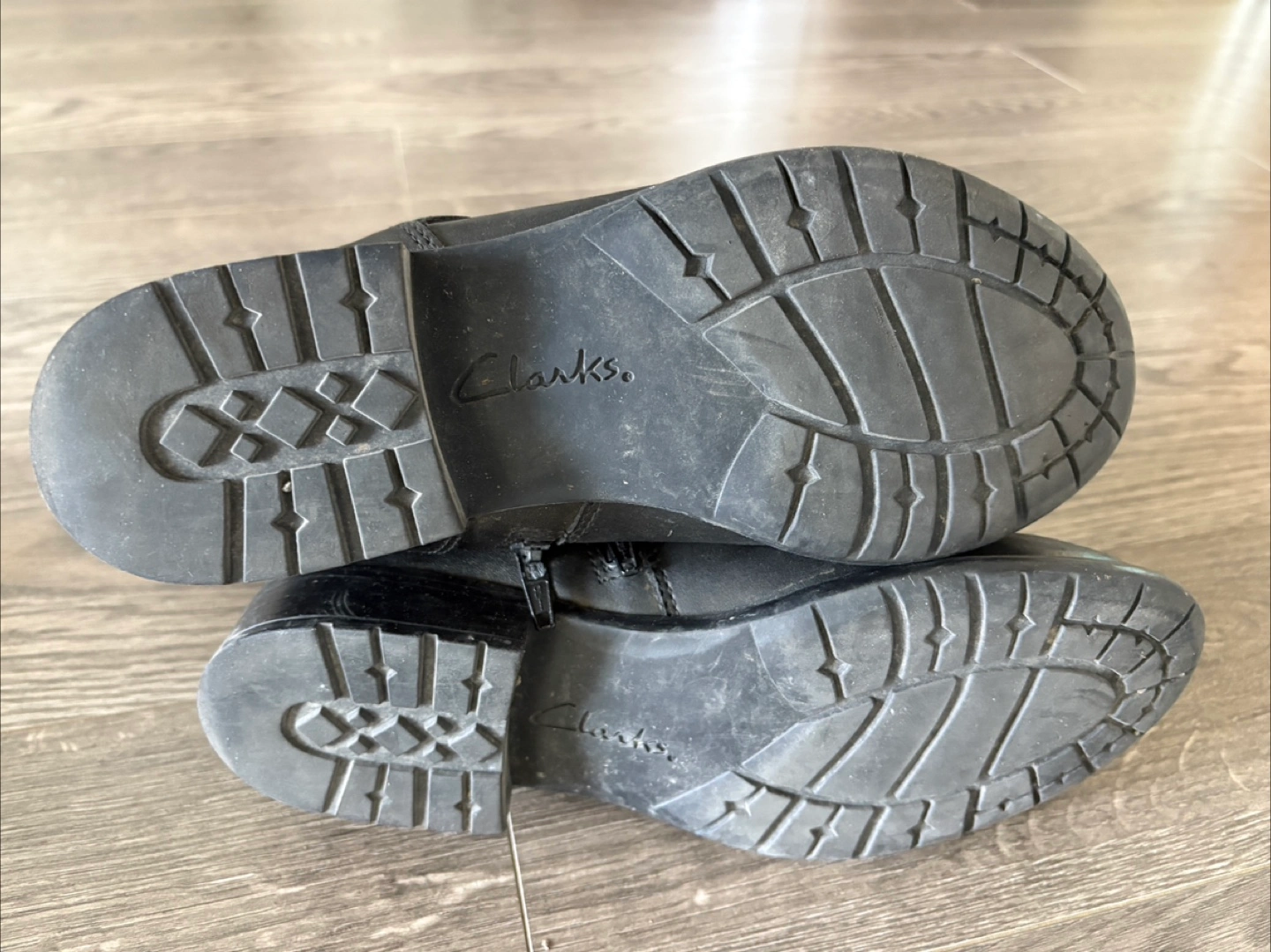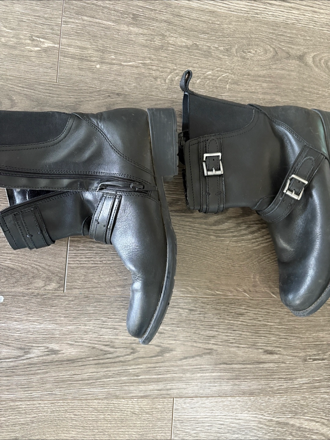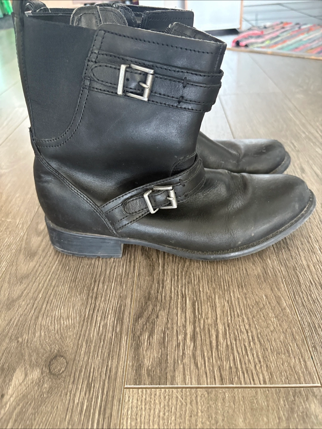 Selling a pair of Clarks black leather ankle boots. They show some signs of wear, but are still in good condition for everyday use. The boots feature a buckle design and a side zipper for easy wear. Perfect for adding a bit of edge to your outfit! true to size 7 usa women
