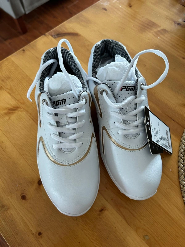These PGM women's golf shoes are brand new and ready for the green! They come in a stylish white with gold accents and include the original shoe bag. Pickup only St Clair East and O'Connor