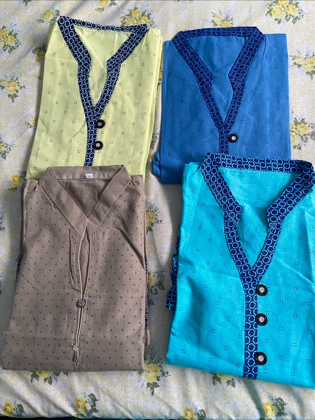 Selling a few ladies' kurti dresses, size large. They're in great condition and ready for a new home! Available in beige, blue, light blue, and yellow.