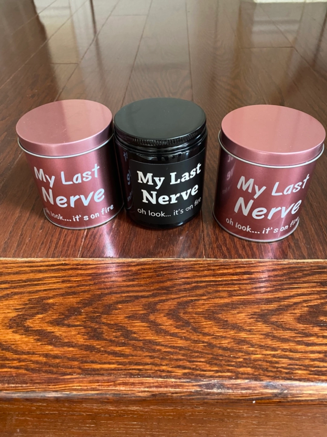 Selling a set of three candles. Two are in a rose-gold tin with the words 'My Last Nerve' and 'oh look... it's on fire'. The other is in a black jar and is scented Black Cedar Juniper Cash only