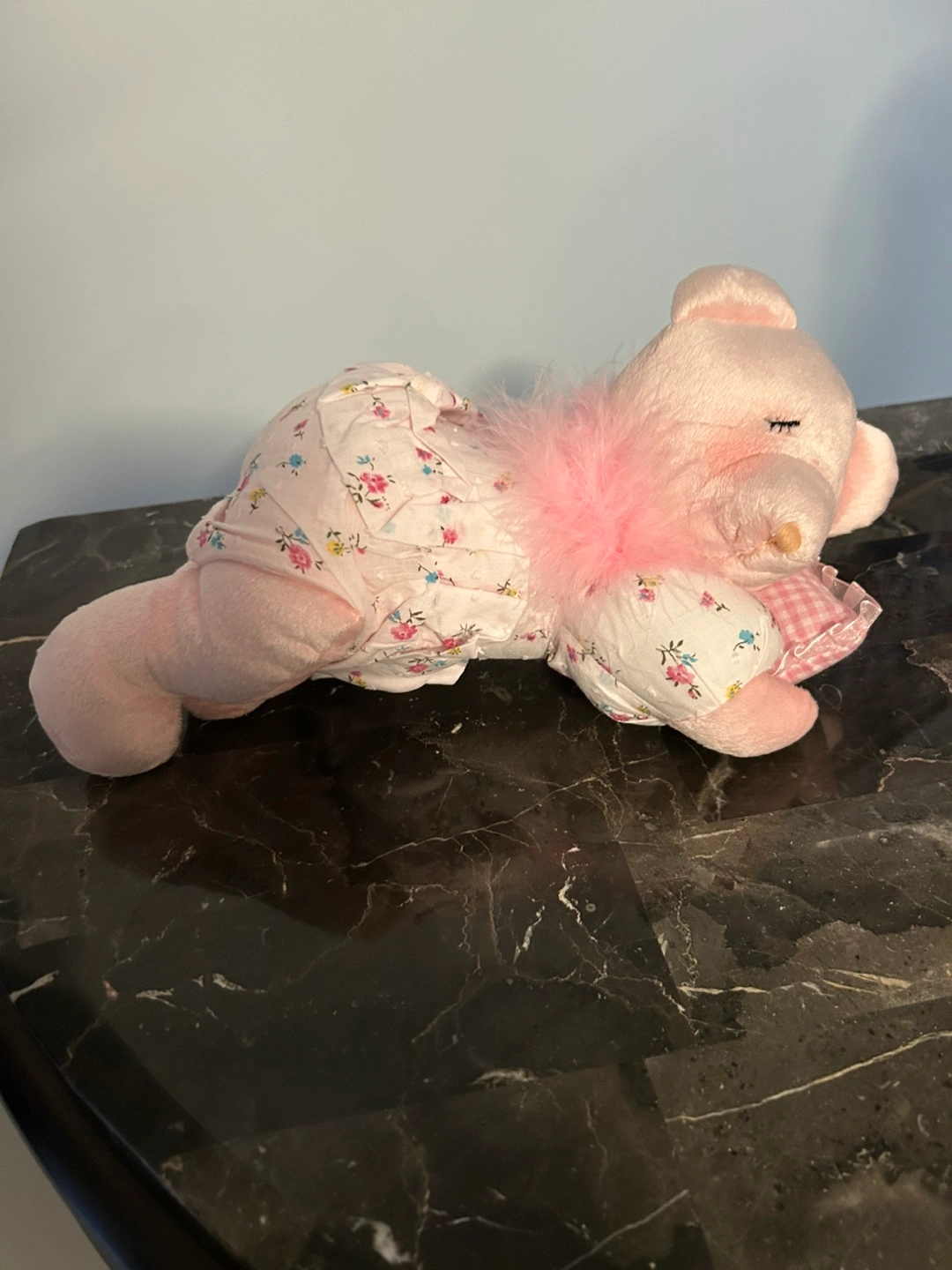 Selling a cute pink plush bear pillow doll. It has a floral pattern on its body and a pink checkered pillow on its head. I have multiple available.