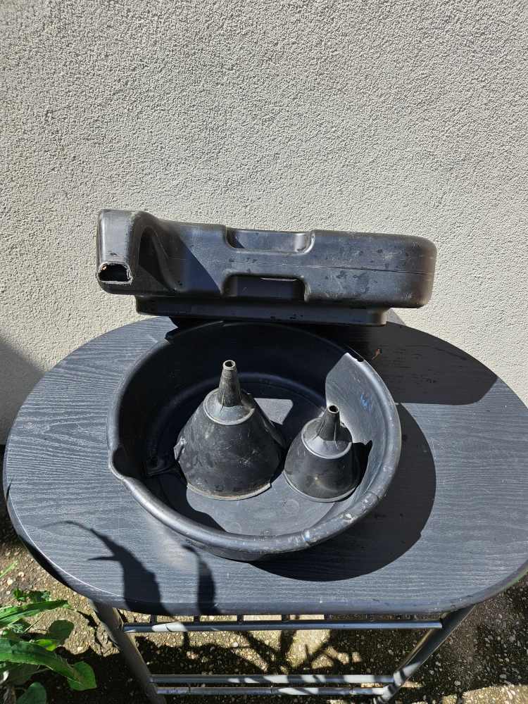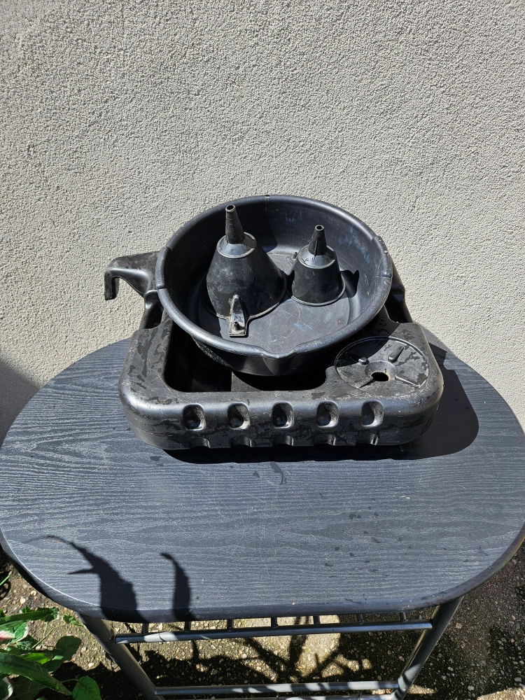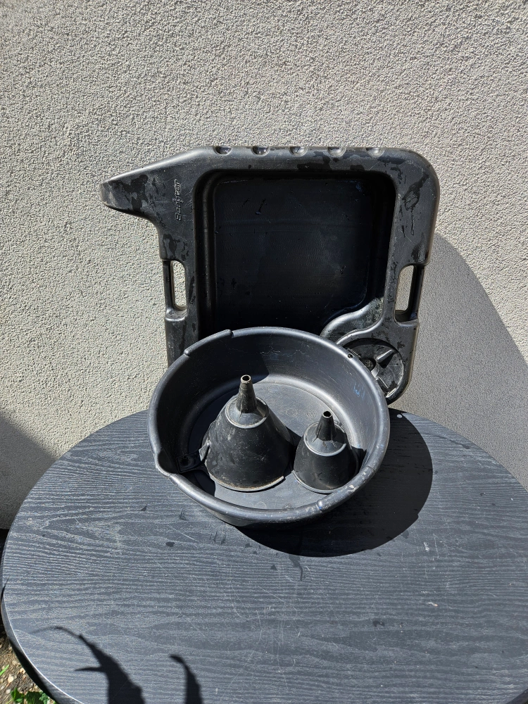 Selling an oil drain pan, perfect for your next oil change! Comes with two funnels for easy pouring and to avoid spills. It's in good condition and ready to use.