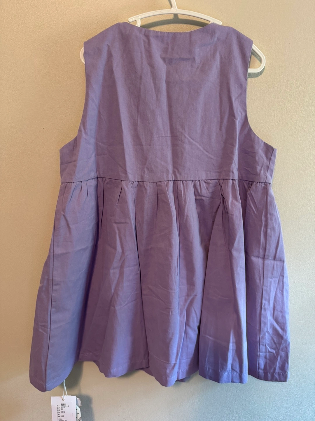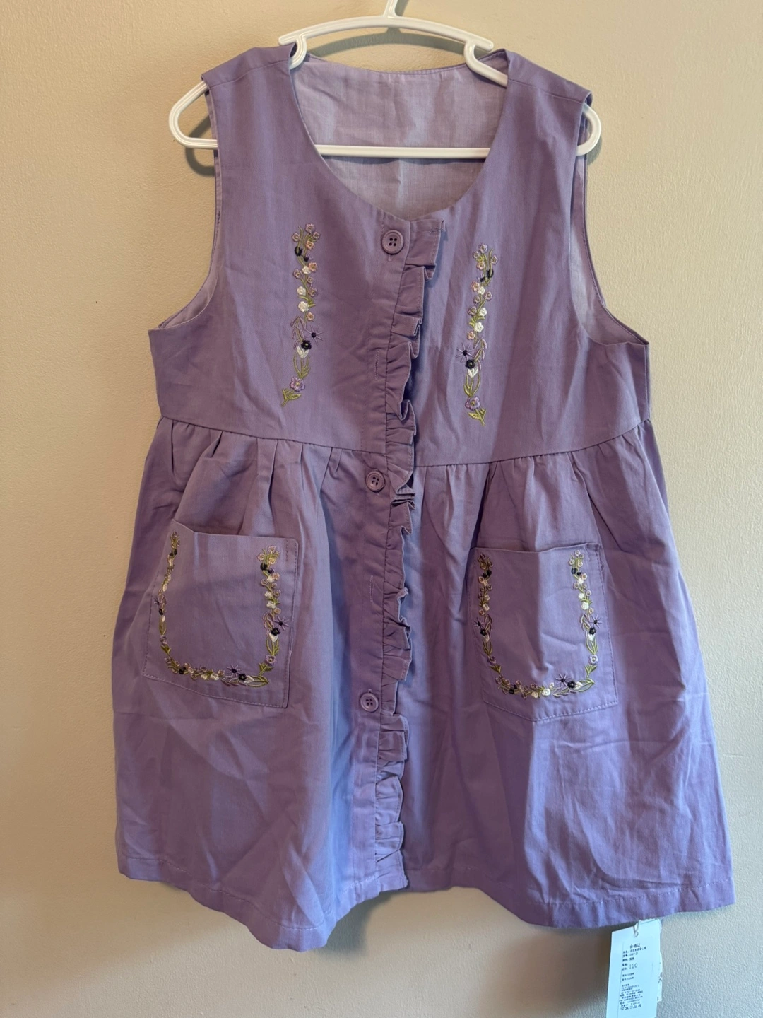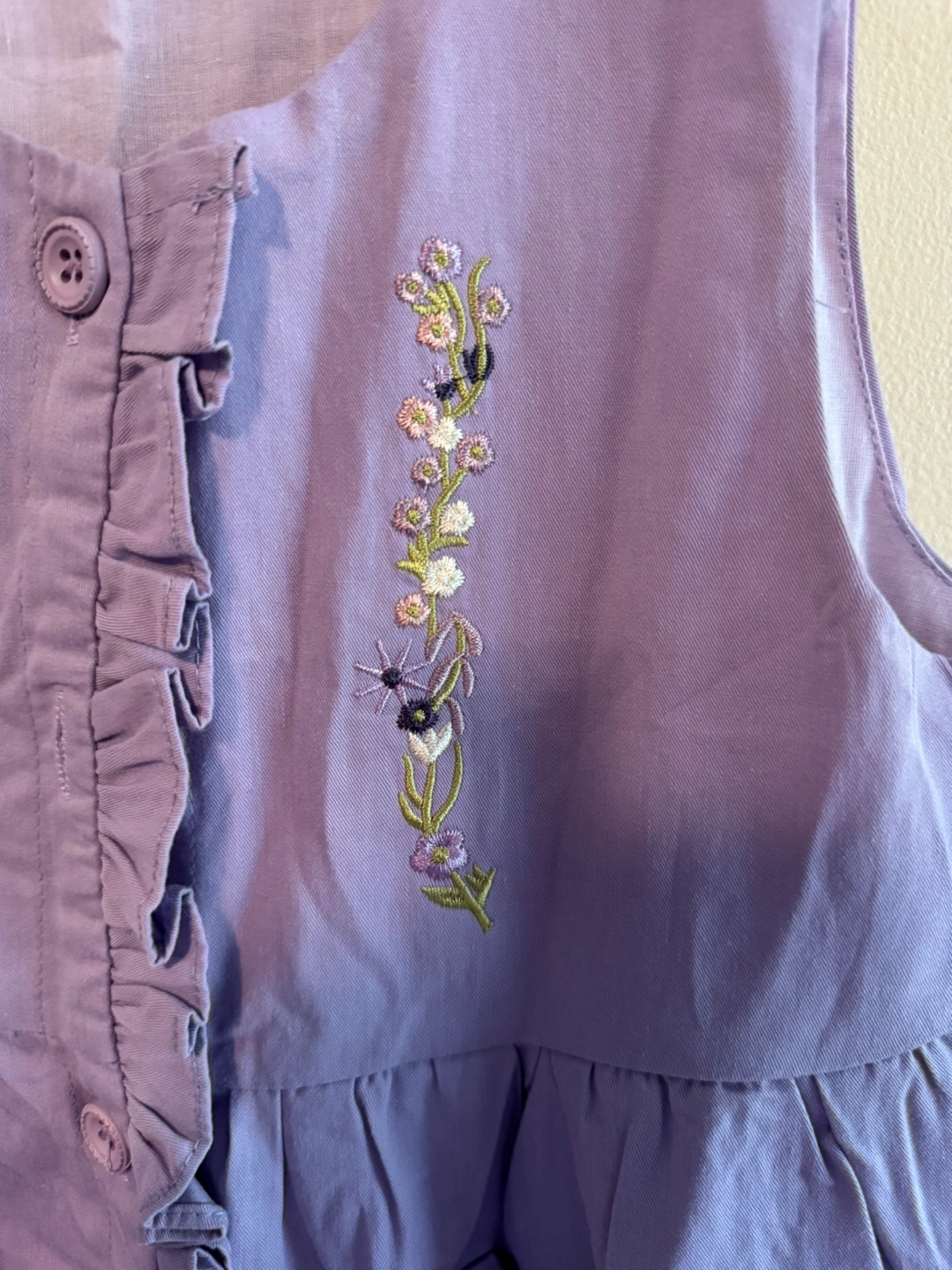 A cute purple sleeveless dress with floral embroidery made by 100% Cotton. It features ruffles along the button line and two front pockets, toddler size 4-5T