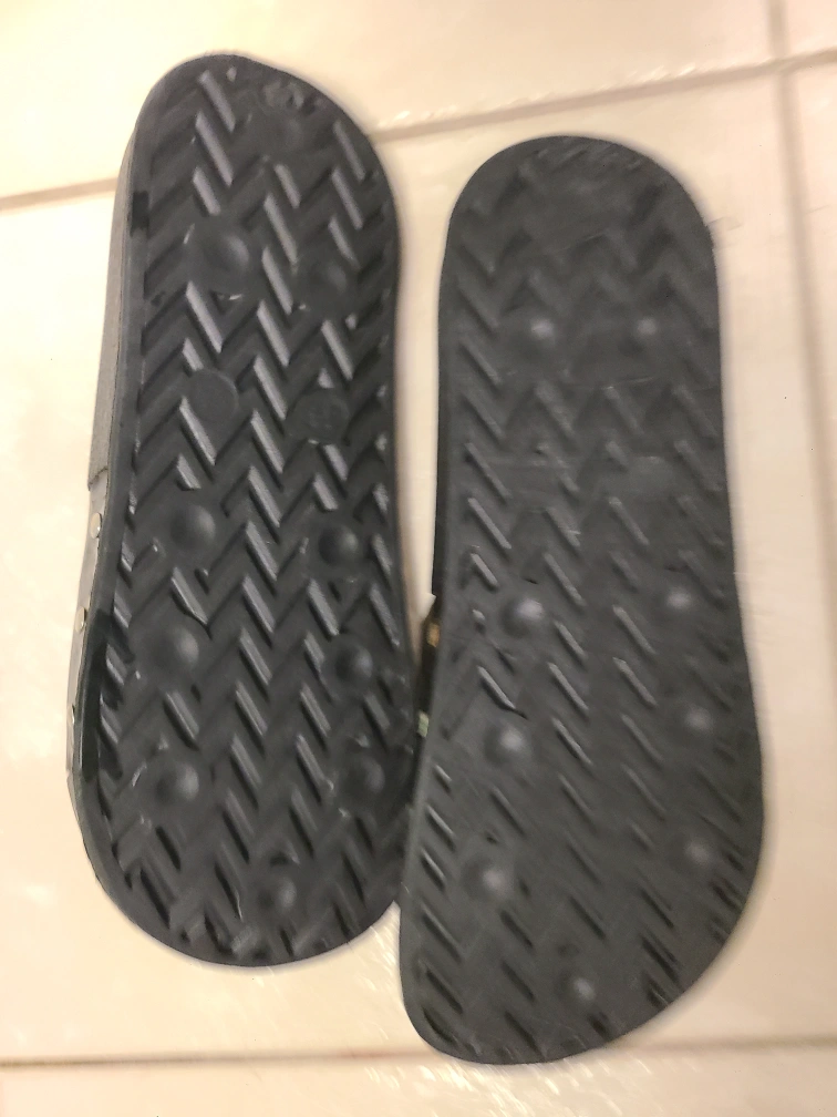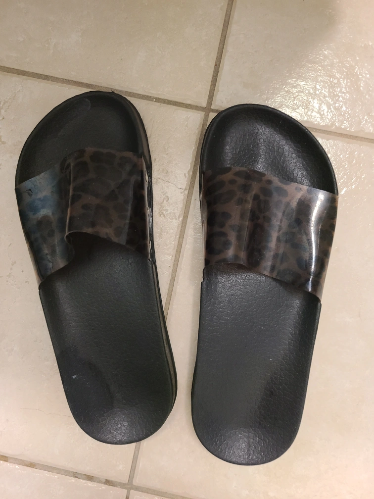 Selling a pair of black slides with a leopard print strap. They're in good condition and ready for a new home