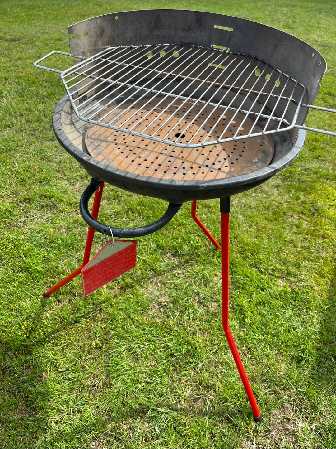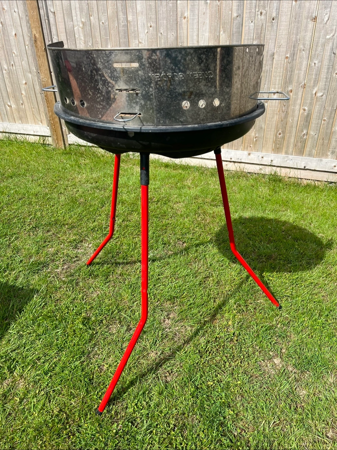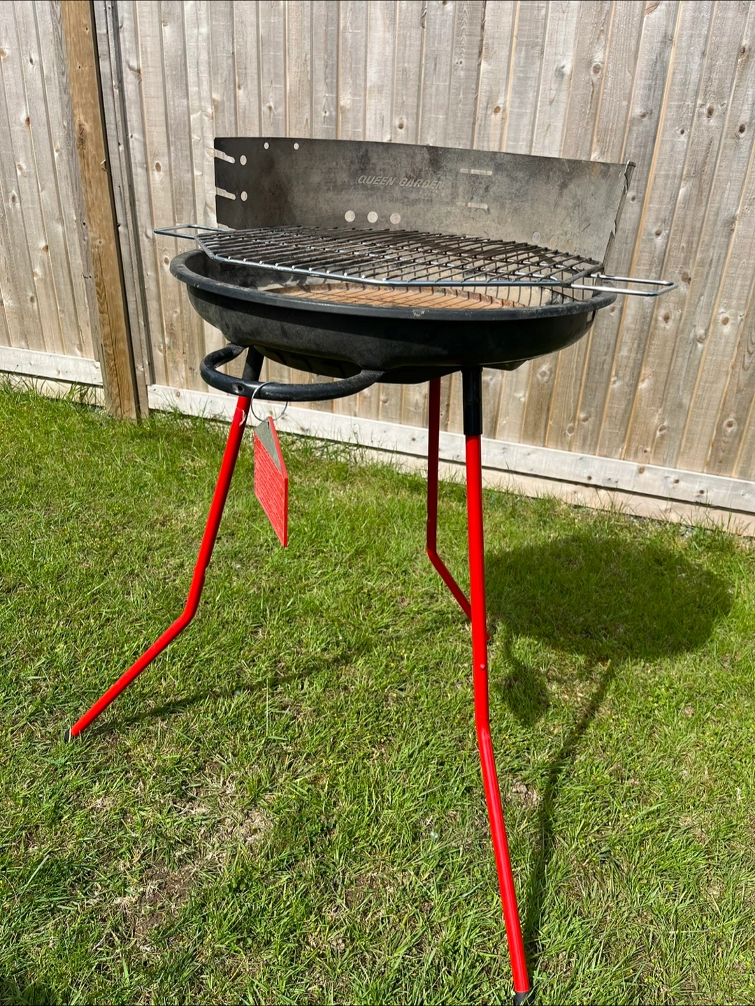 Red portable charcoal BBQ. Features a round metal bowl, ash catcher, wire cooking grate, metal wind guard, support legs, utensils tray. Easy to assemble and disassemble. Used two times only. In great condition. If you see this ad, the BBQ is still available.