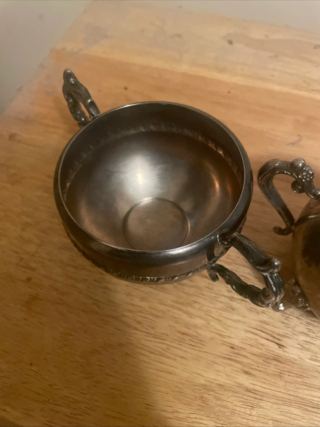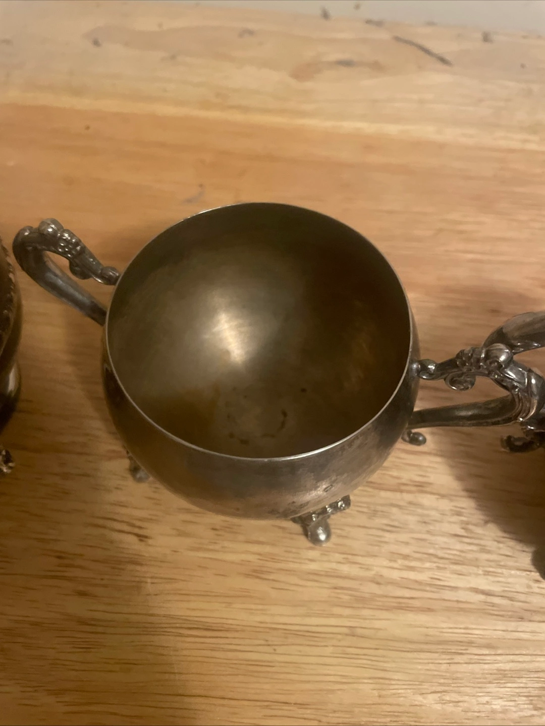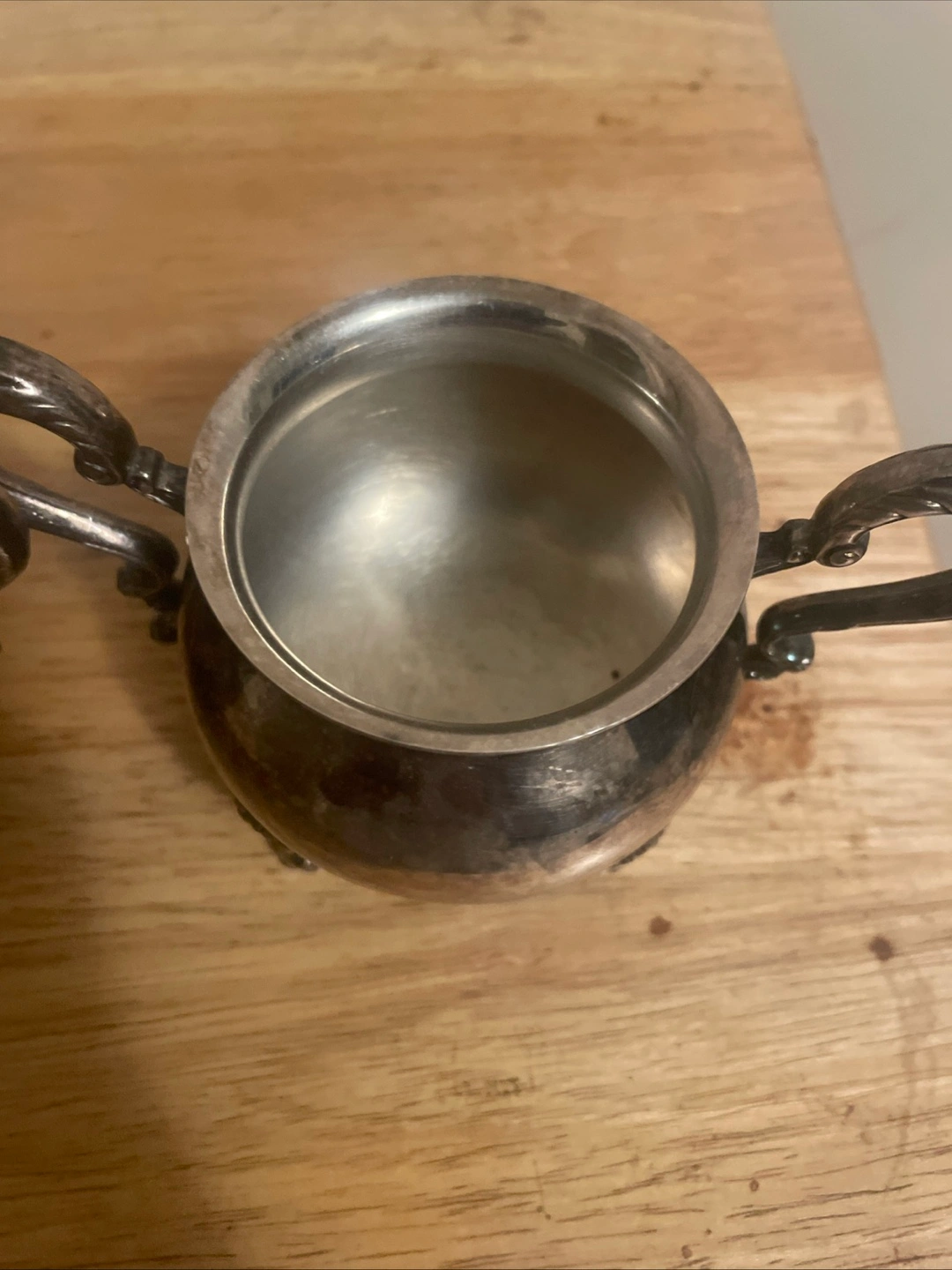 Selling a vintage silver sugar bowl. It has a nice, classic design with ornate handles and feet. Would look great in any home!
