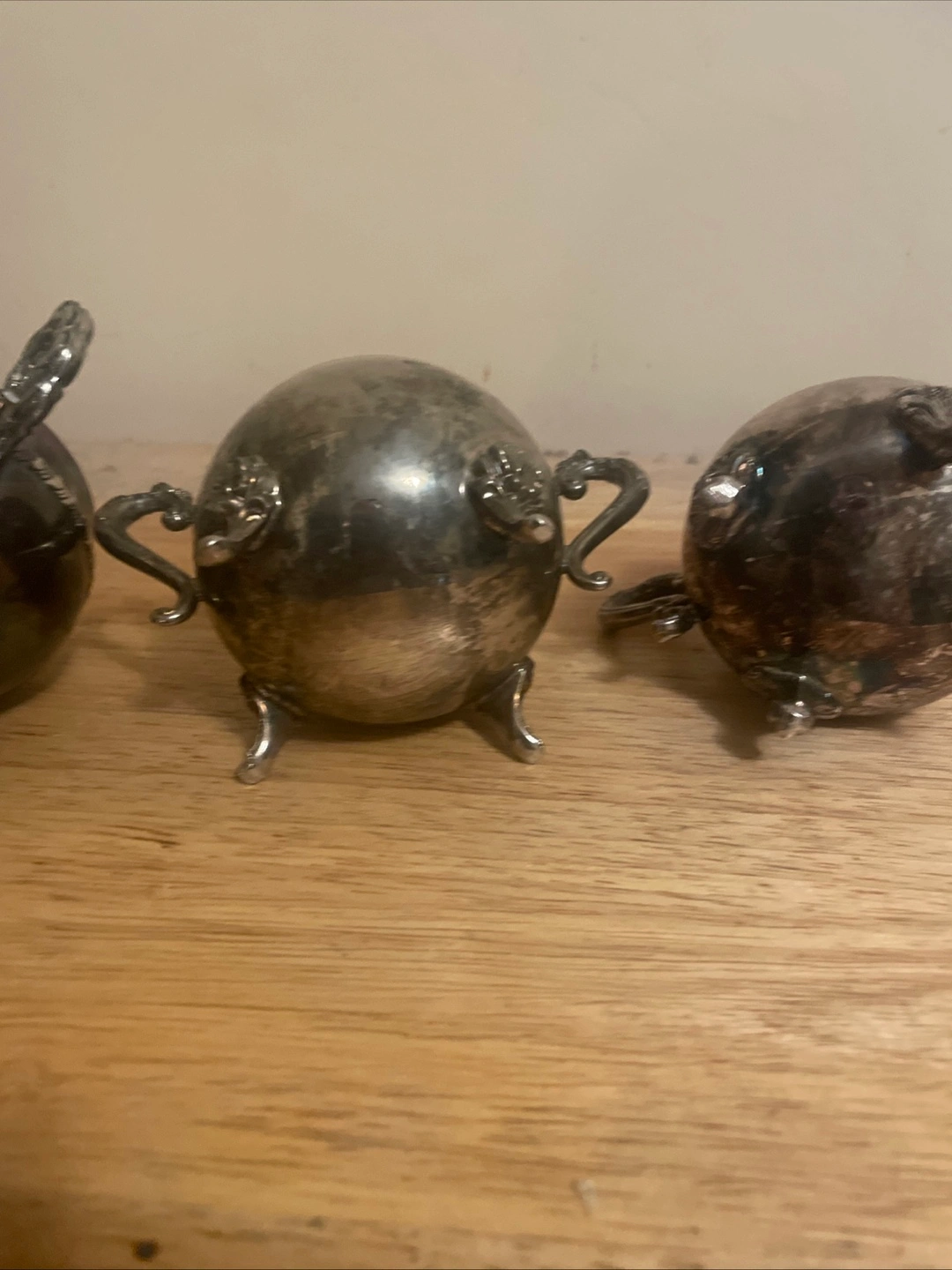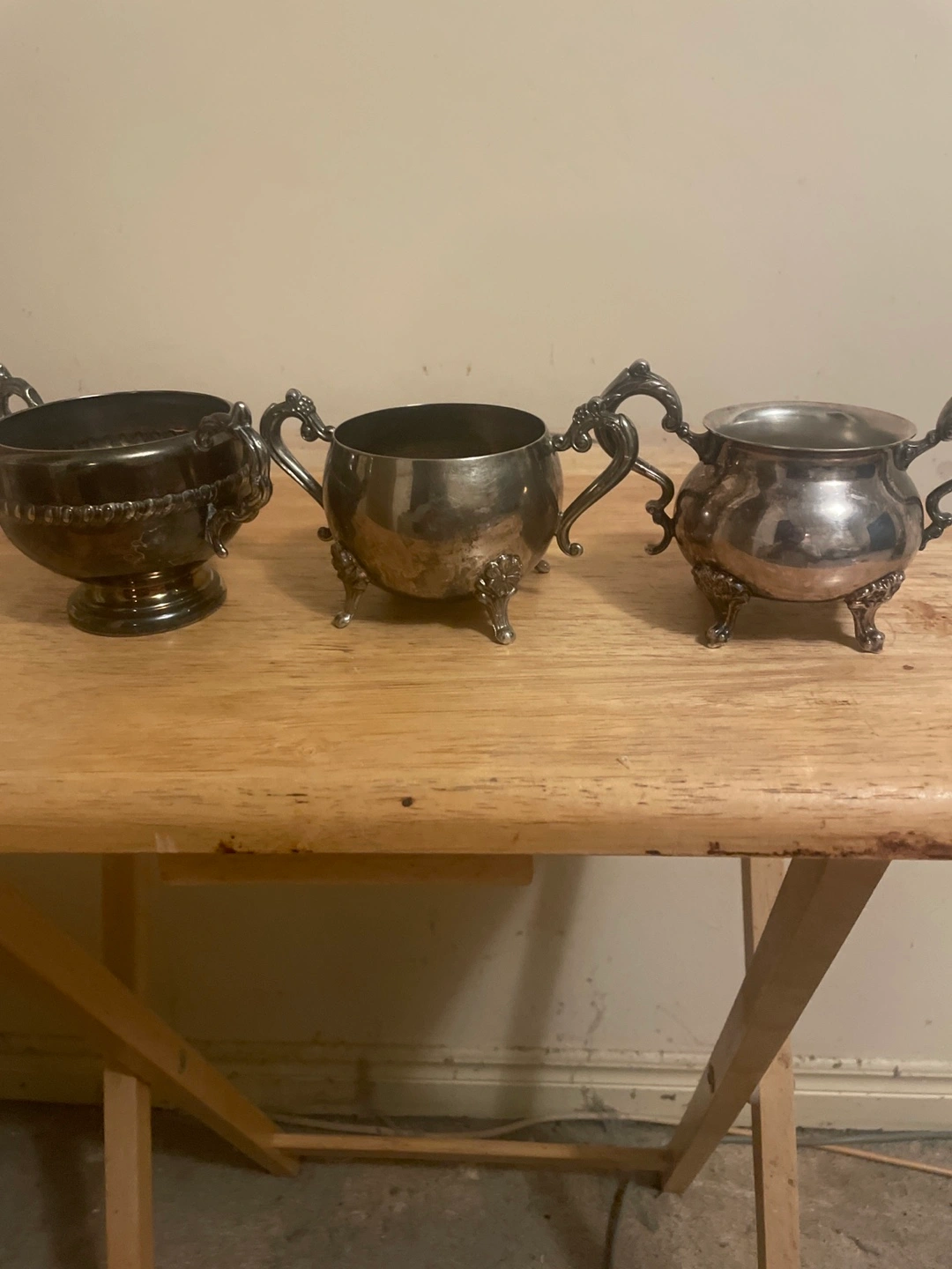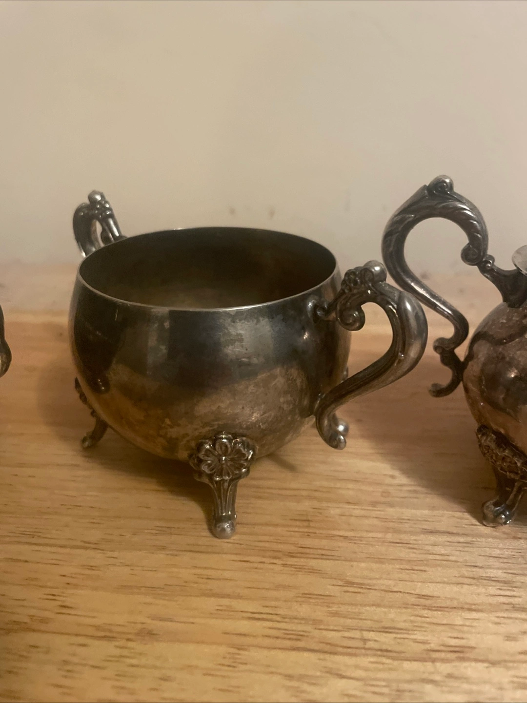 Selling a vintage silver sugar bowl. It has a nice, classic design with ornate handles and feet. Would look great in any home!