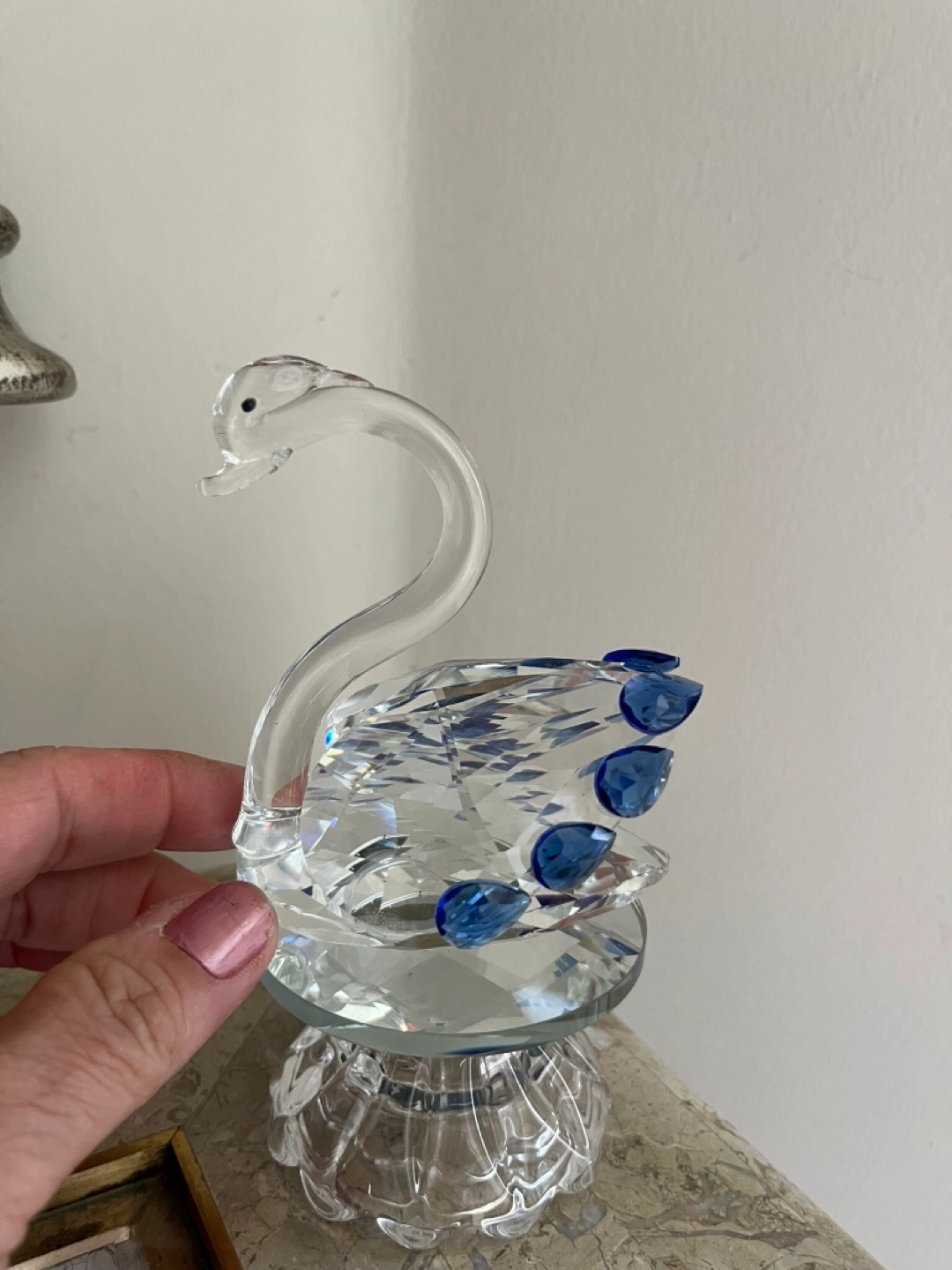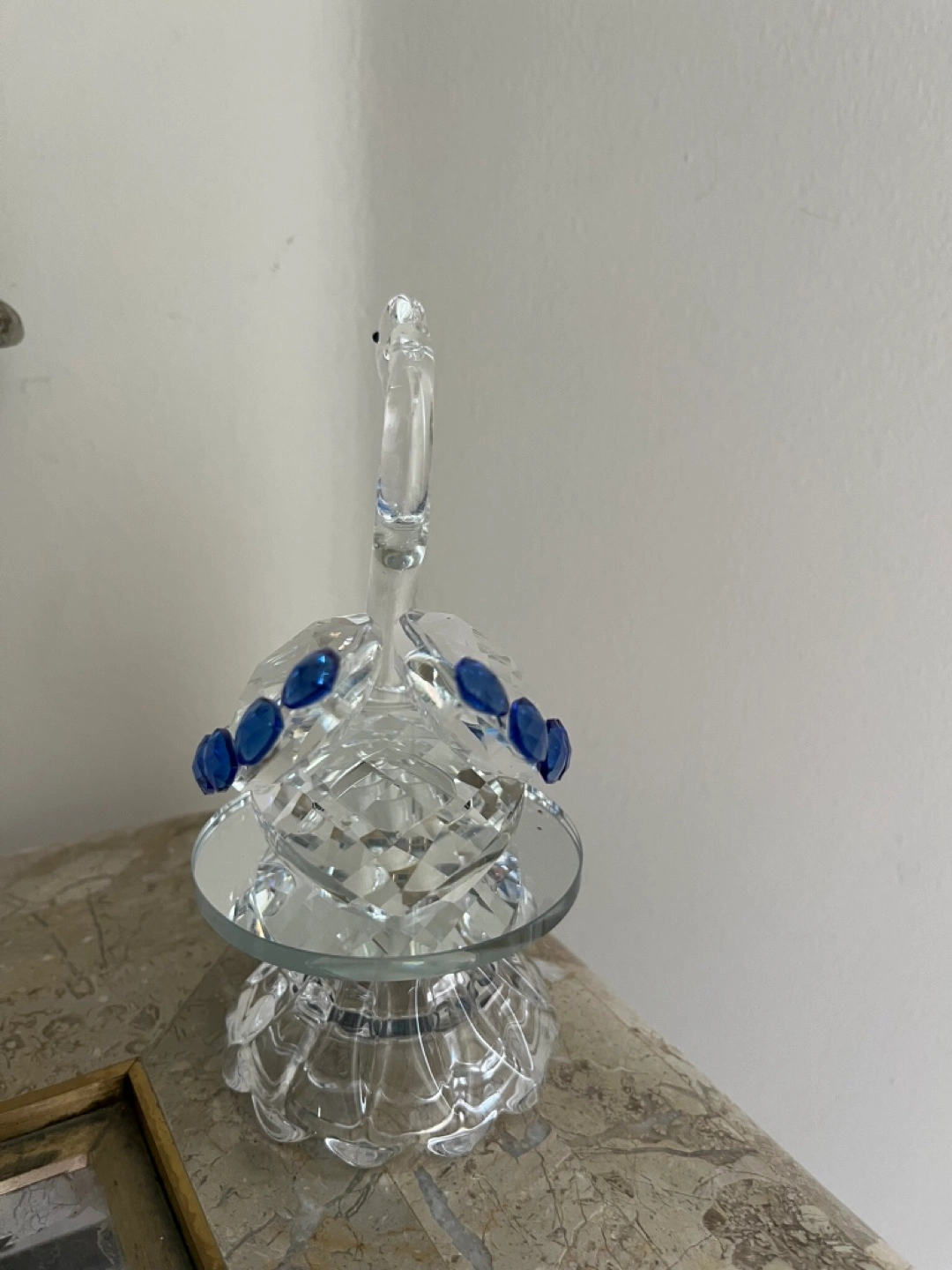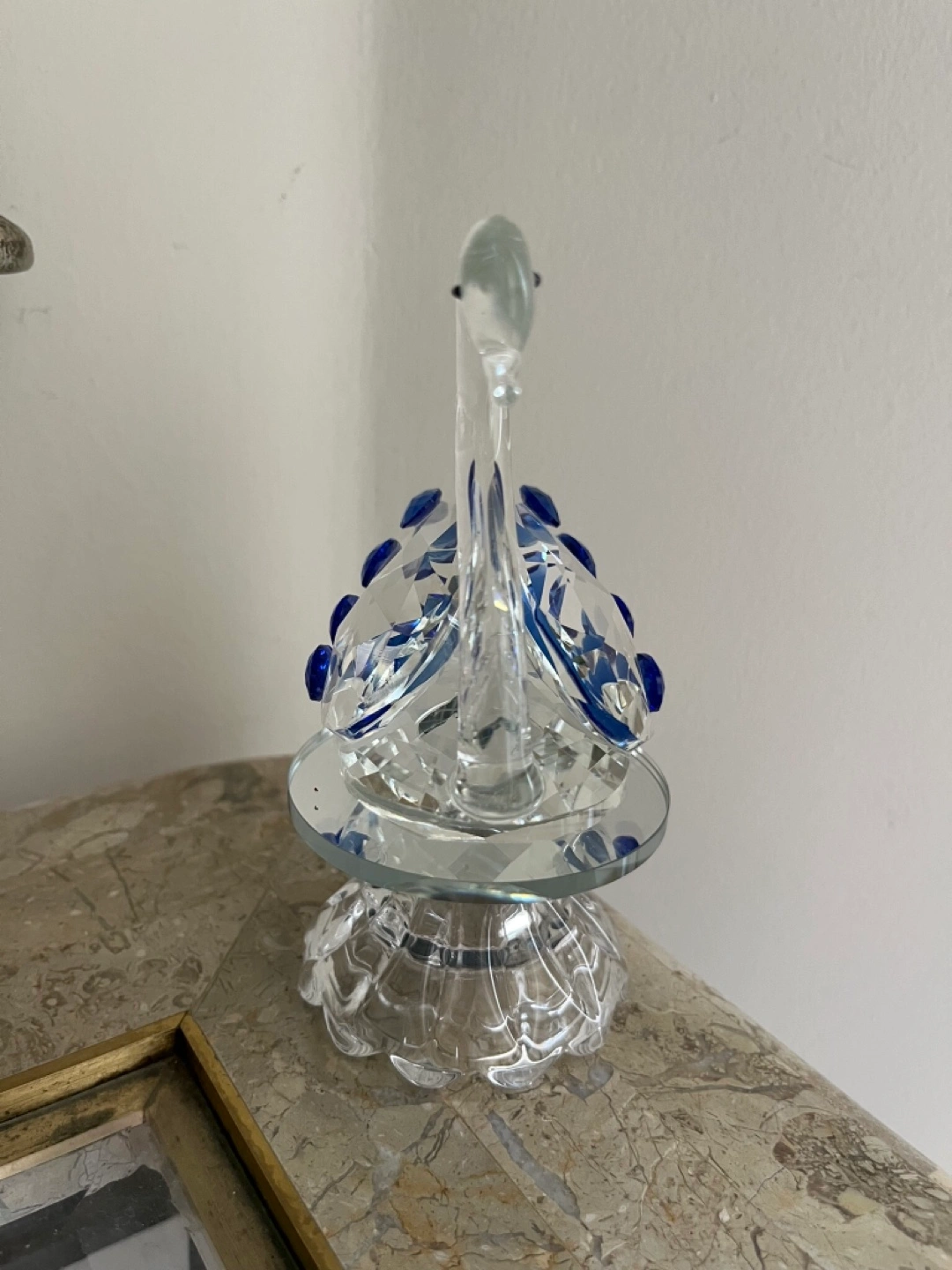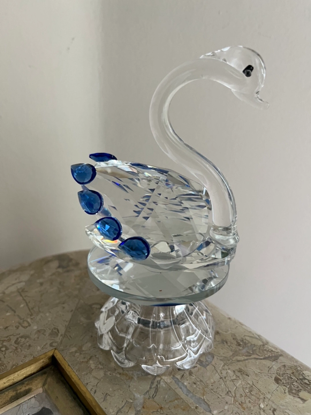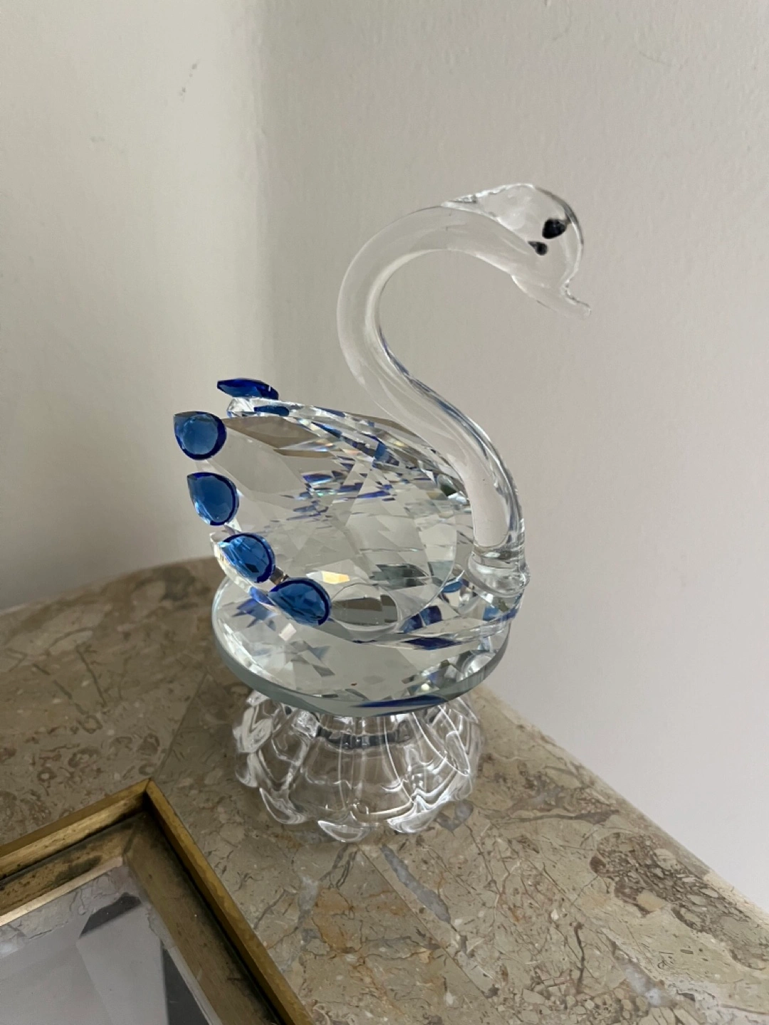 This is a beautiful crystal swan figurine. It features clear crystal with lovely blue accents. On a swivel stand. Comes in box. Cash only Bathurst And Steeles Pick up