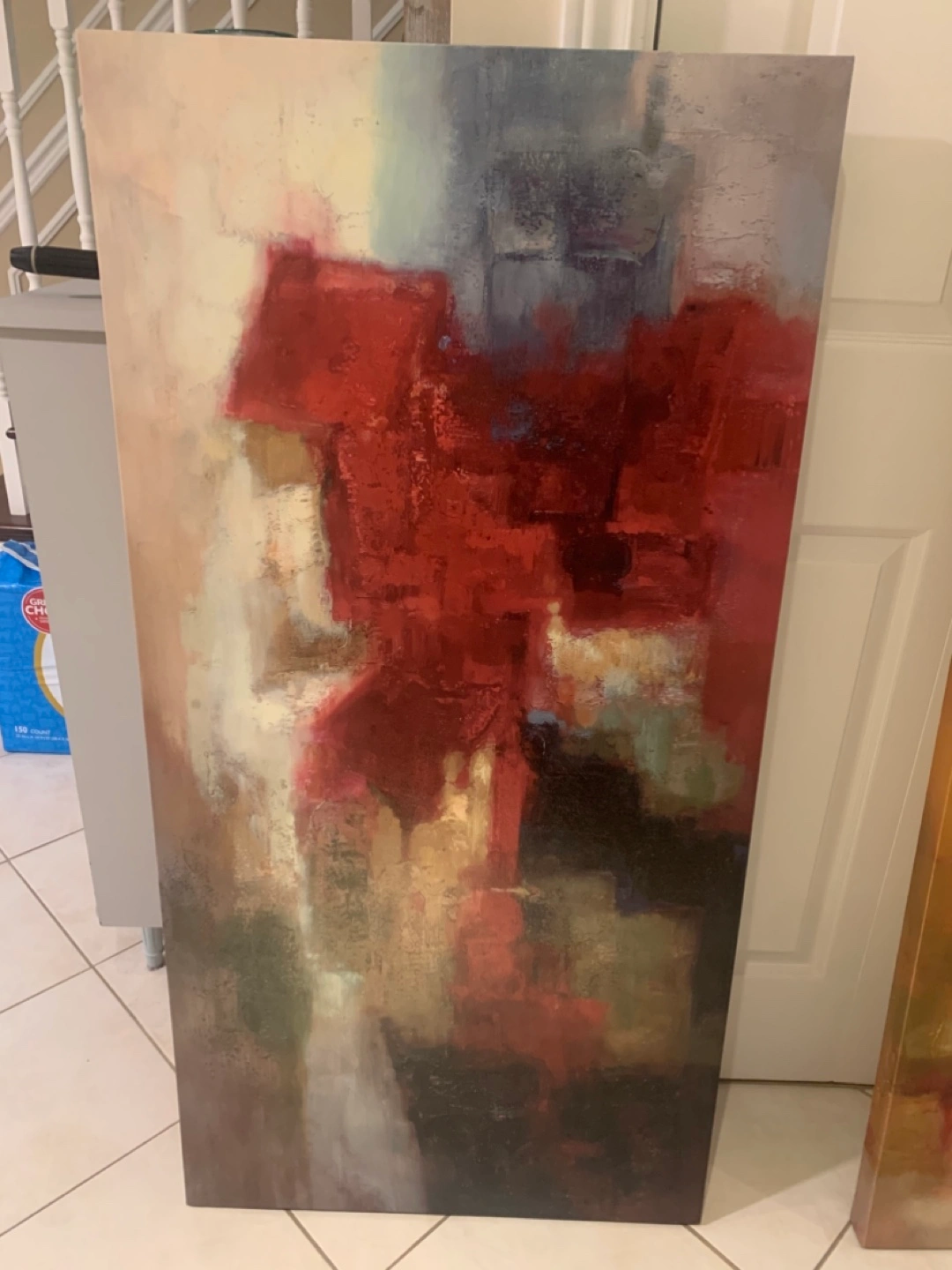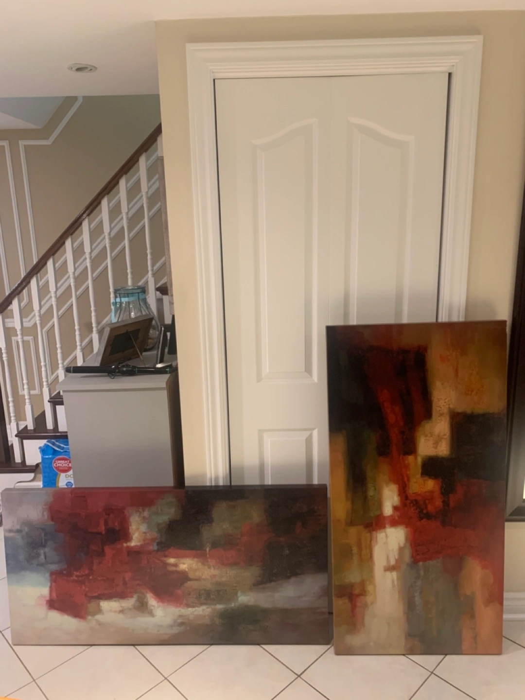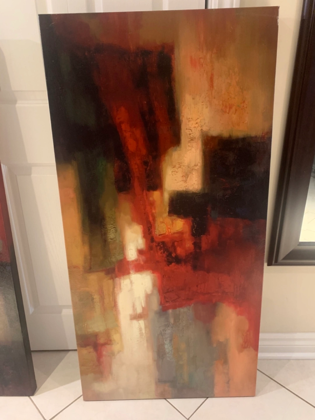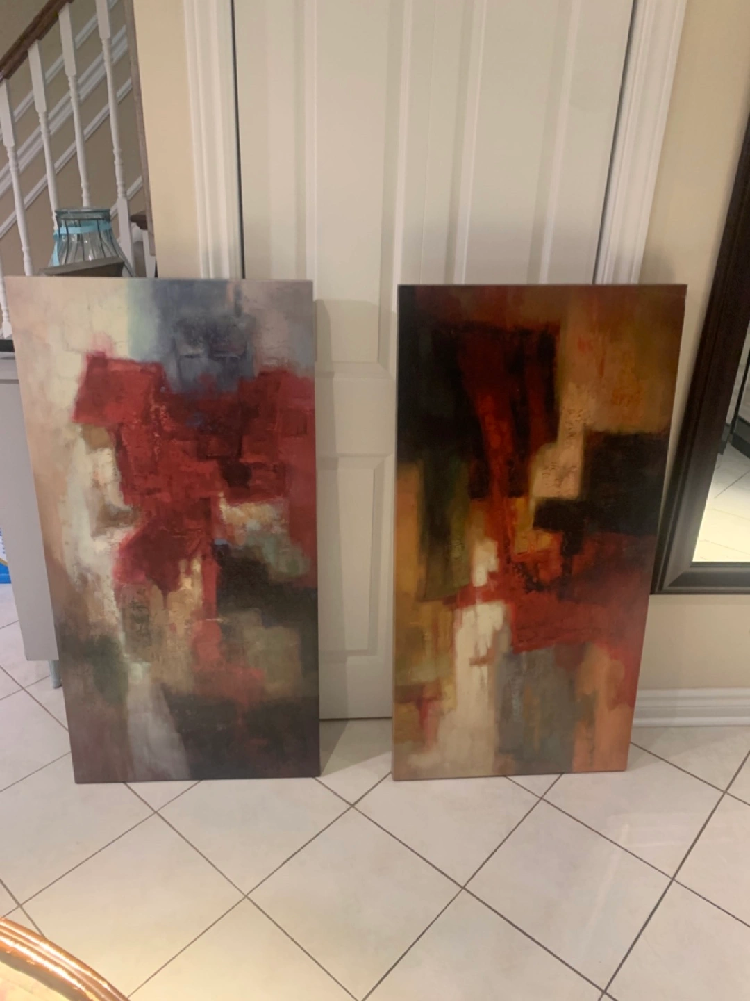 I'm selling a set of two abstract wall art pieces. They feature a mix of red, brown, and neutral tones. These paintings would look great in any living room or office space! Feel free to text me for more information on this product.
