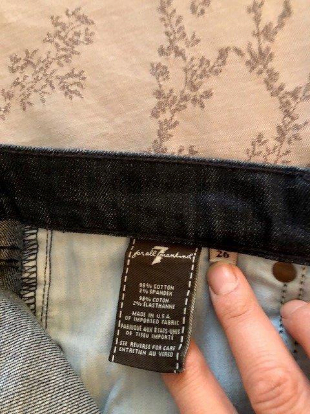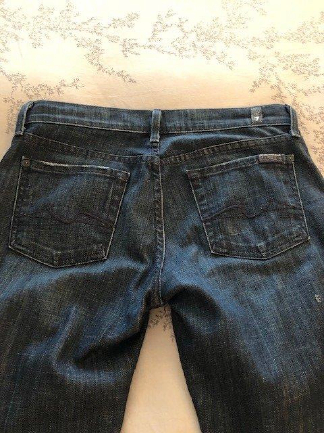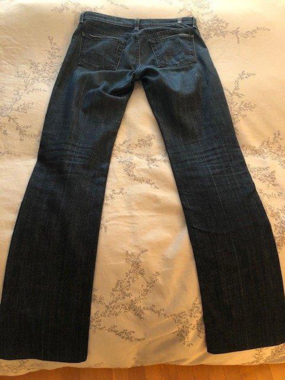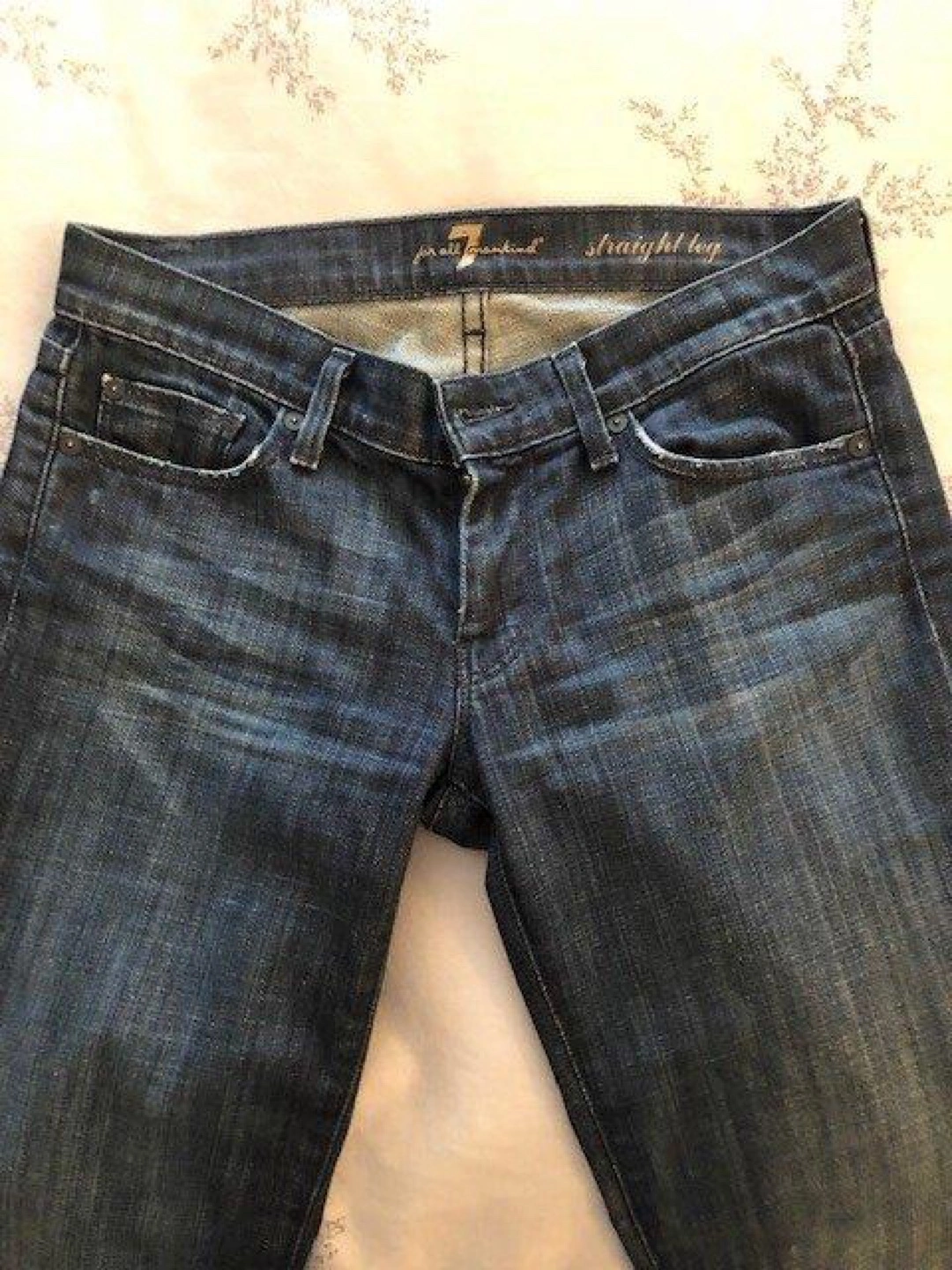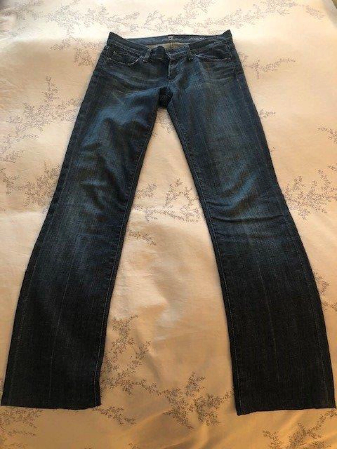 Gently used 7 for all Mankind straight leg jeans in size 26 with slight boot cut. The material is 98% cotton and 2% elastane. Top of belt to crotch area is 7 inches…more like a low rise style. From a smoke and pet free home. Pickup only in the St Lawrence market area of downtown Toronto. Cash only.