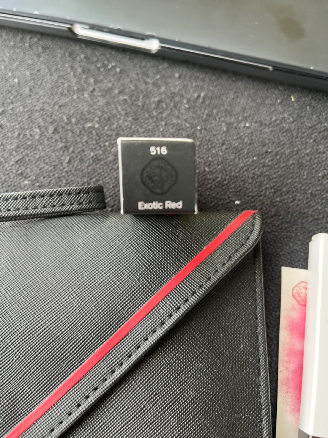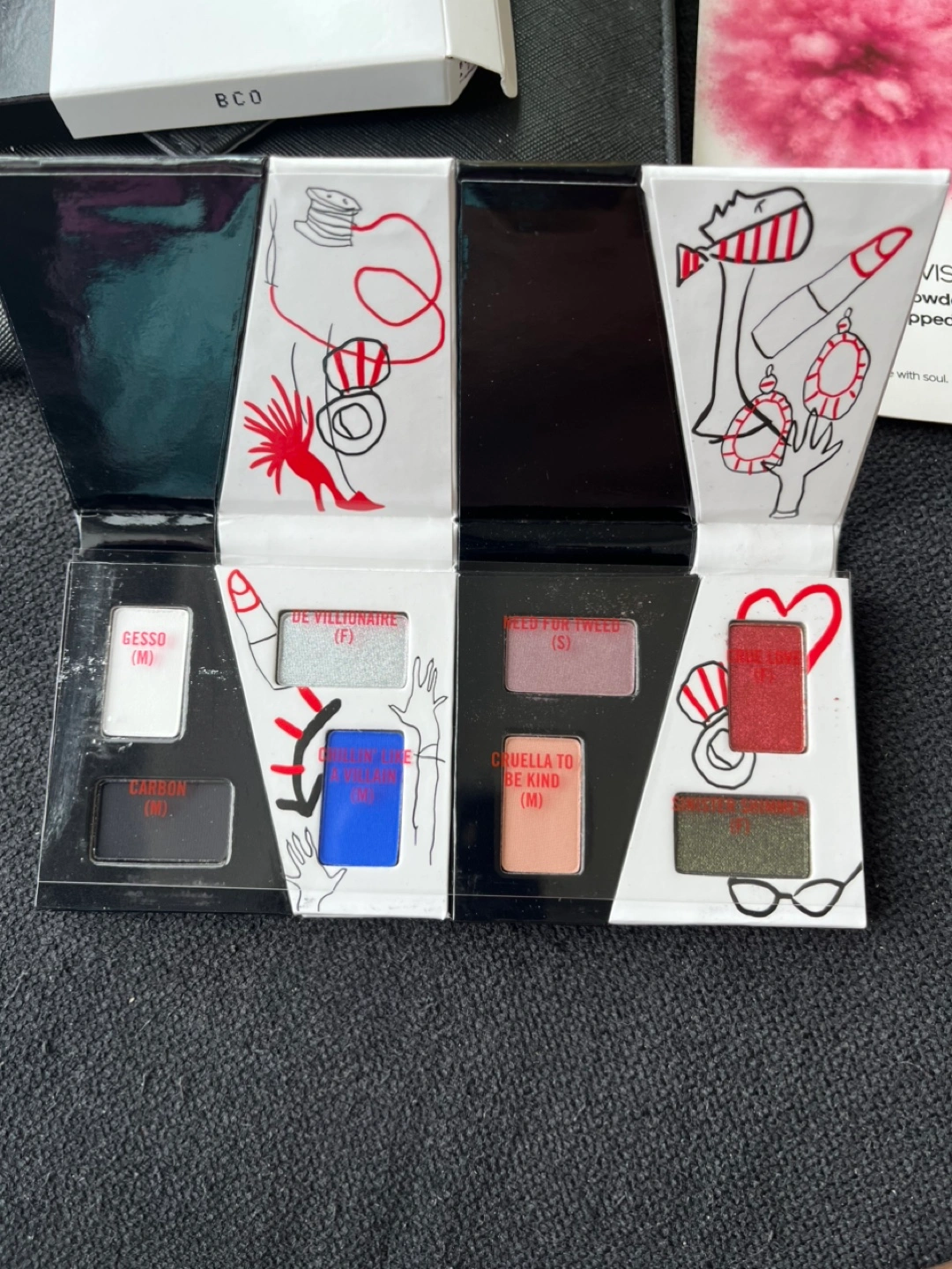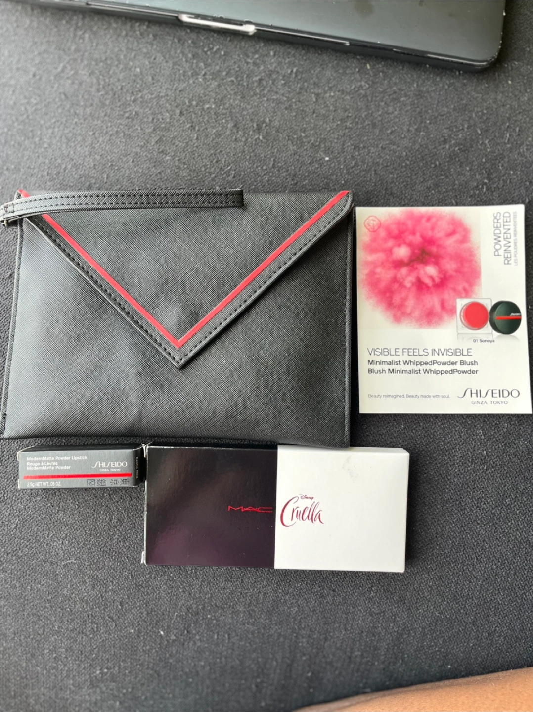Selling: - Shiseido ModernMatte Powder Lipstick in Exotic Red (516) along. - MAC Cruella eyeshadow palette. - Black Clutch. Set in a great condition!