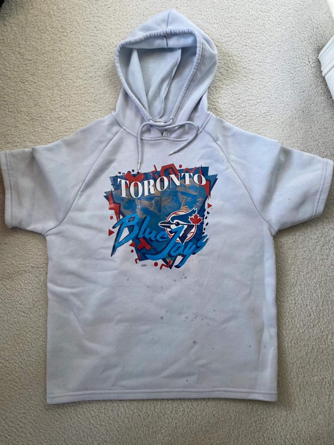 Selling a Toronto Blue Jays hoodie! It's a light grey colour and features the Blue Jays logo. There are some spots on the front.
