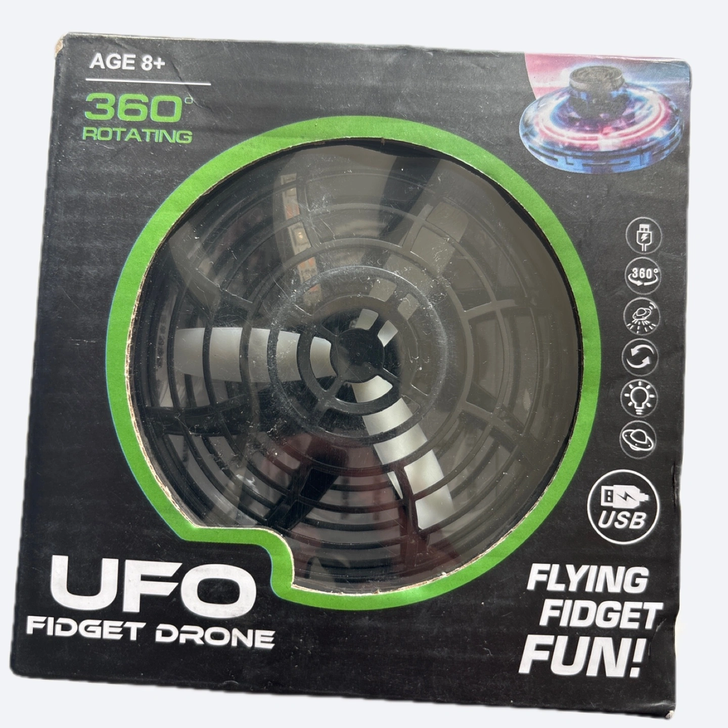 Get ready for some flying fidget fun with this UFO fidget drone! It's designed for ages 8 and up and features 360° rotation. This fidget drone is USB chargeable and provides hours of entertainment!
