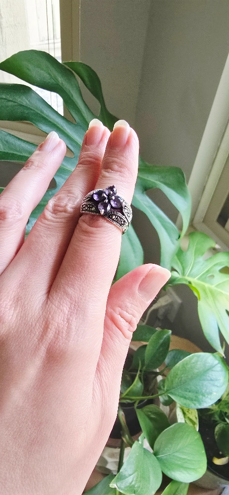 Selling a beautiful sterling silver ring featuring amethyst stones. The ring has a lovely floral design.