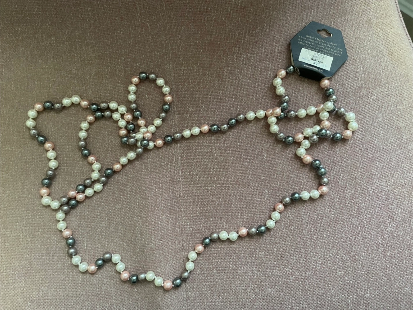 A lovely pearl necklace featuring pink, grey, and white pearls! It's a stylish accessory to add a touch of elegance to any outfit