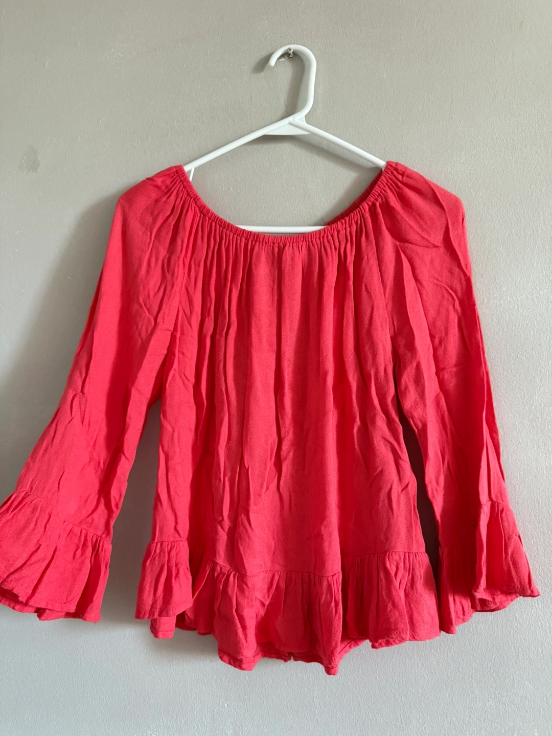 Off shoulder blouse. This cute top features long, bell sleeves and a ruffled hem.