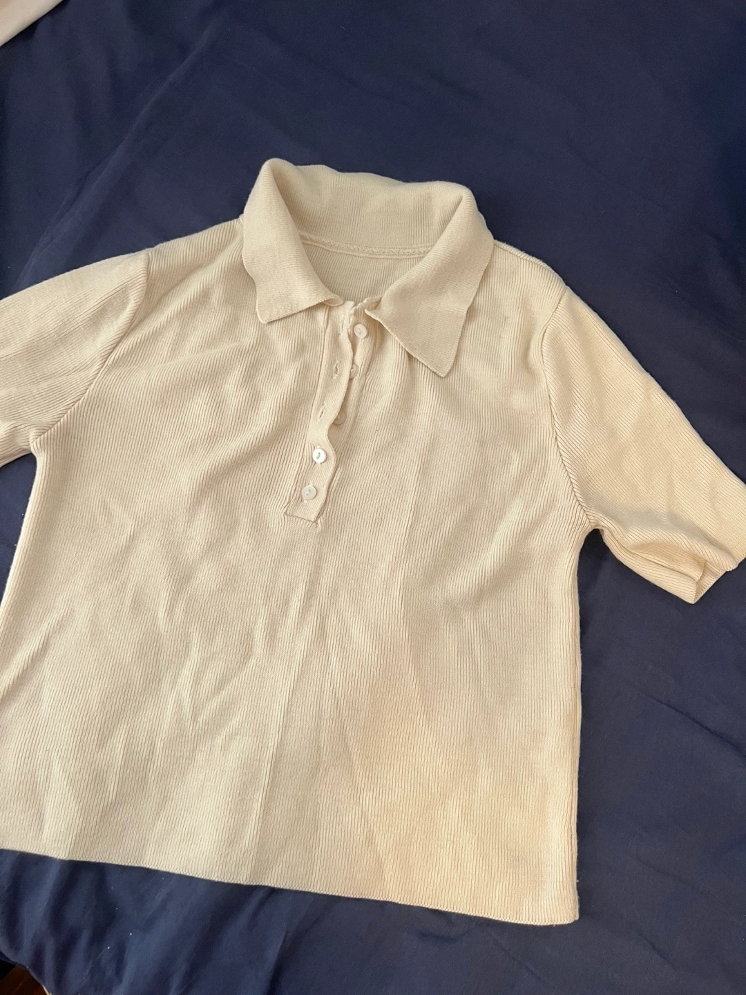 A cute beige polo shirt! It has a ribbed texture and a classic polo collar with button details, perfect for a casual yet stylish look