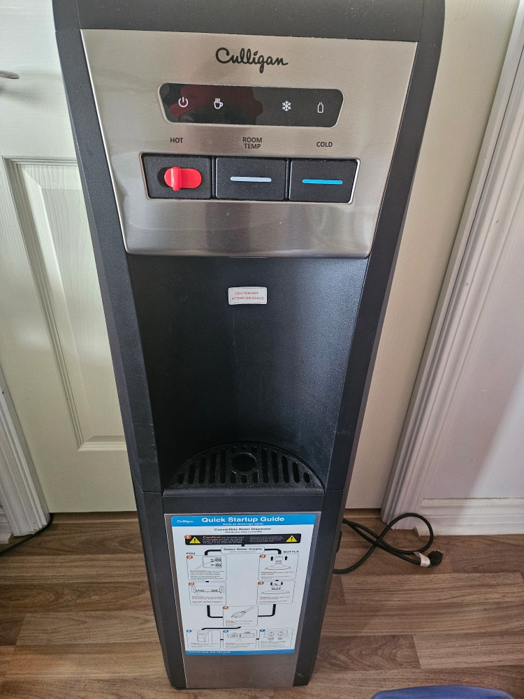 Selling a Culligan water dispenser (bottom loading water cooler) that offers hot, cold, and room temperature options! It's in great shape and ready to use in your home or office. Perfect for staying hydrated with your preferred water temperature. 3- or 5-gallon water bottles are mounted under the dispenser. Easily convertible to a bottle-free cooler 2.0 Gallons per hour cooling capacity at 43°F-50°F. 2.0 Gallons per hour heating capacity Temperature range 165°F-194°F Large 13-inch dispensing area Empty bottle warning light. ENERGY STAR rated.