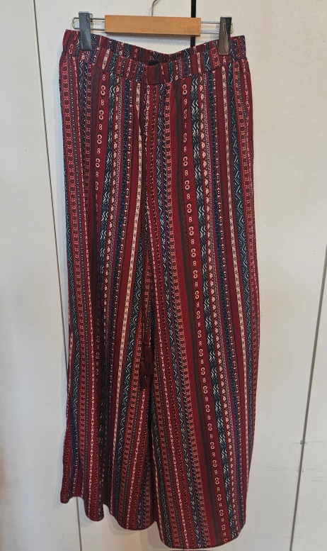 These patterned wide leg pants are in great condition! The material is thin and flowy, perfect for warm weather. The pattern is a mix of red, blue, and white stripes and geometric shapes. They have an elastic waistband for a comfortable fit (only worn once) (from Shein)