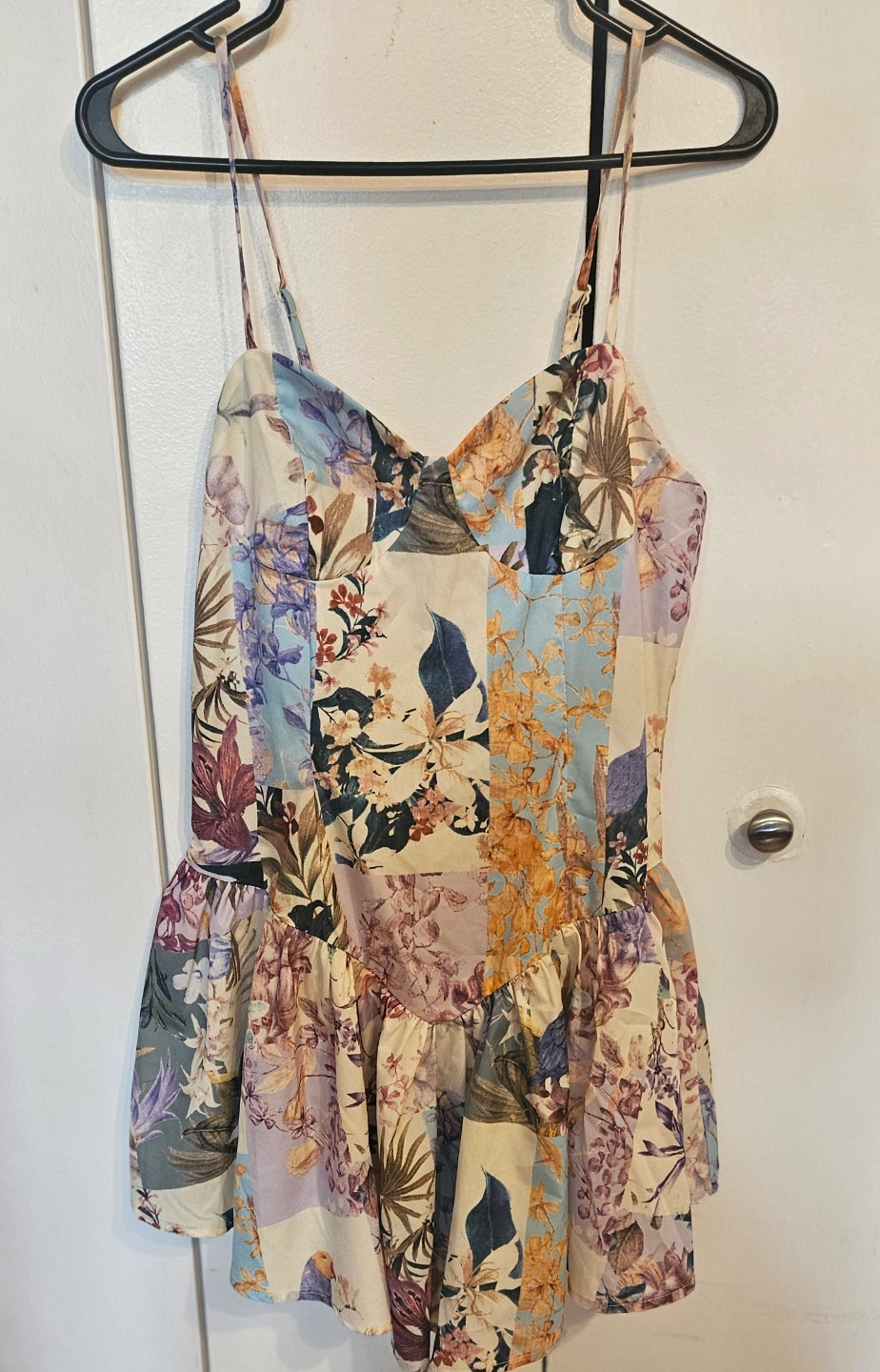 Here's a cute floral print mini dress! It features a mix of floral patterns in shades of blue, purple, orange, and cream. Perfect for a summery day out worn under 5 times, super cute fit ! from Shein