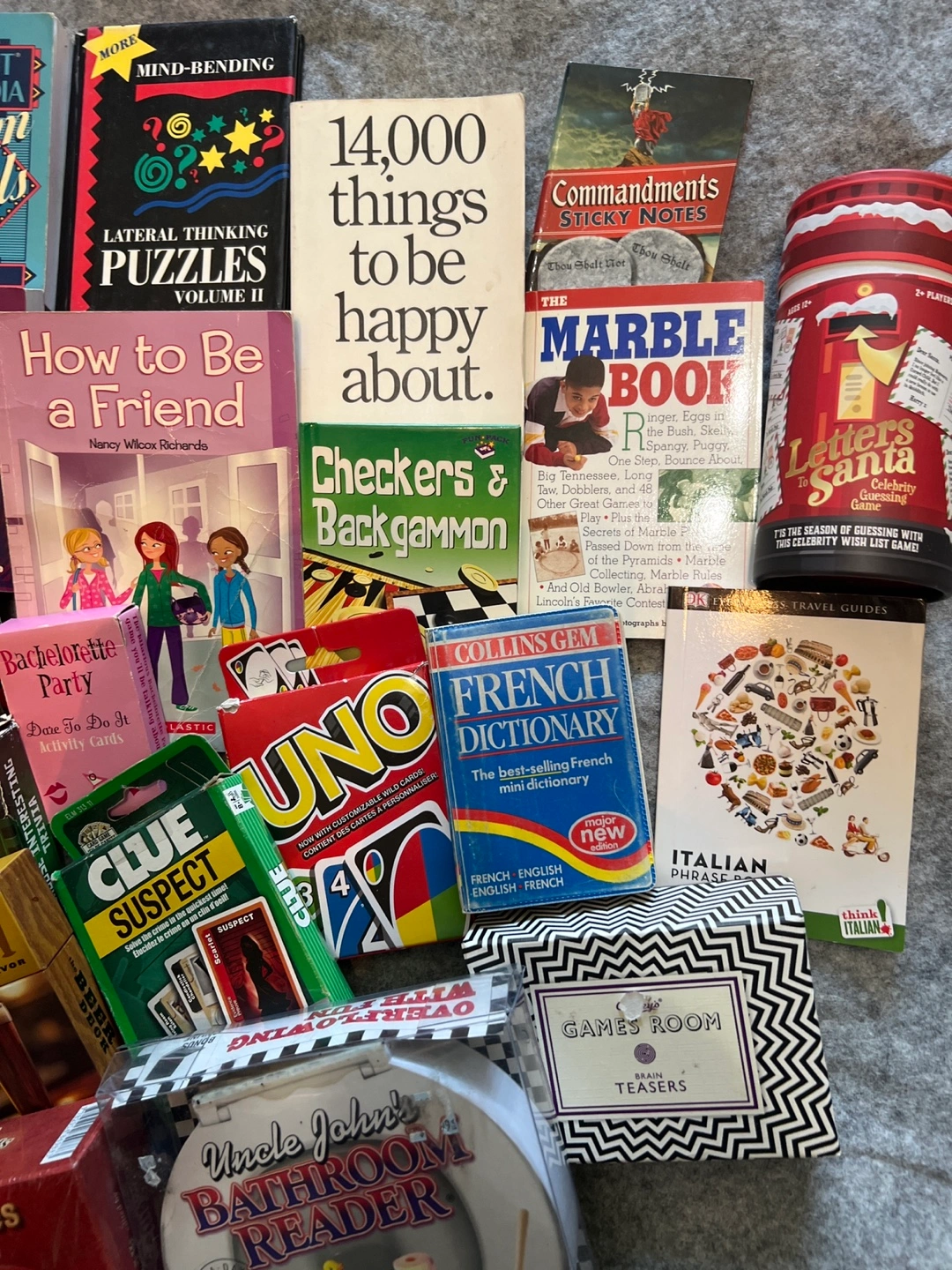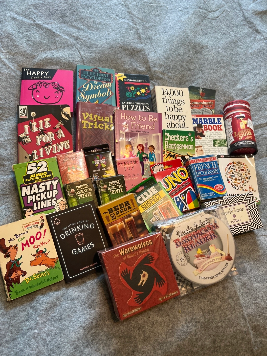 Selling a mixed lot of books and games! Perfect for stocking up your collection or finding a new favourite. Includes titles like: - The Happy Doodle Book - The Little Giant Encyclopedia of Dream Symbols - Mind-Bending Lateral Thinking Puzzles - How to Be a Friend - The Little Book of Drinking Games - And many more!