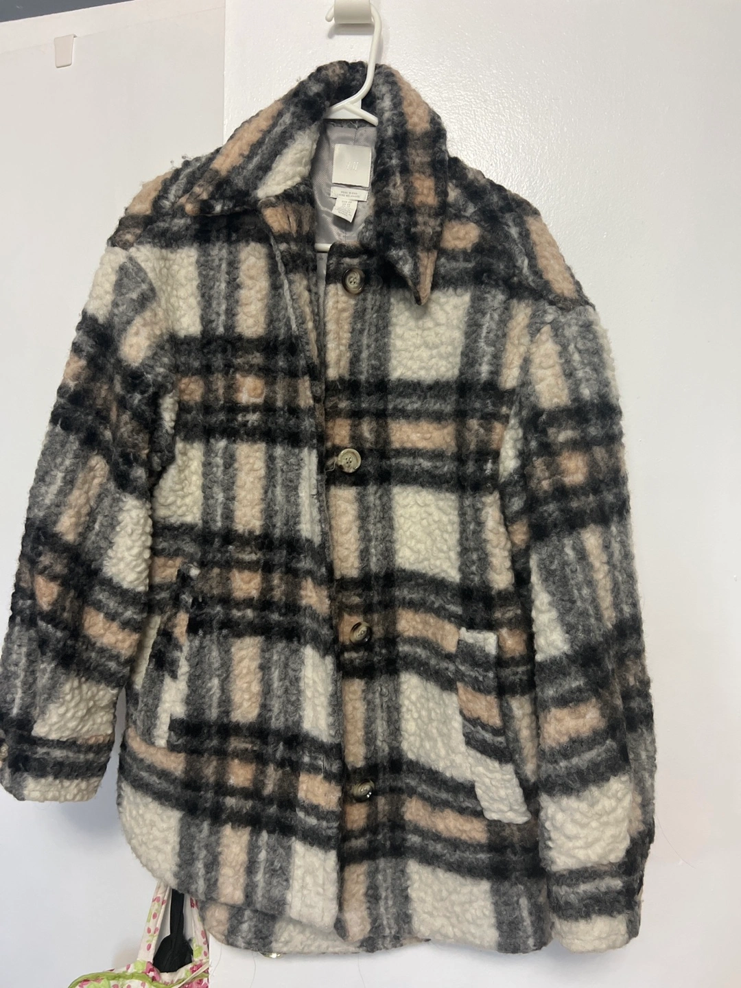 Selling a cozy H&M wool blend shacket in a stylish plaid pattern. It's a size XS and in great condition. Perfect for layering during the colder months!