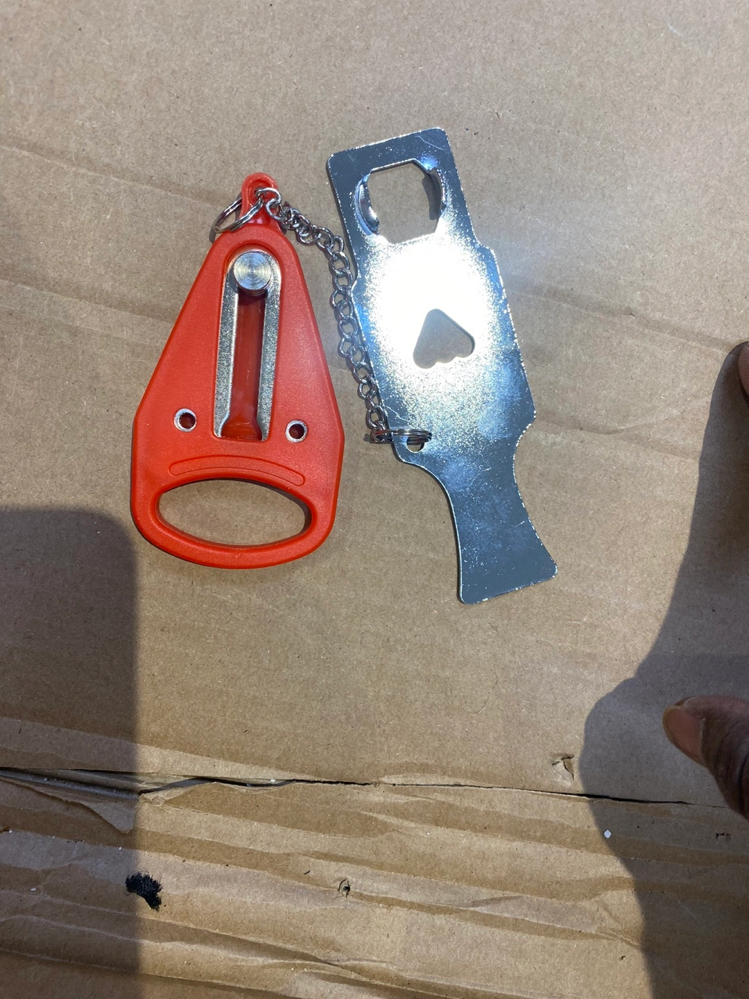 Selling a portable door lock with a bottle opener. It's in good condition and ready to use for added security when travelling or at home. The lock is orange and the bottle opener is silver.