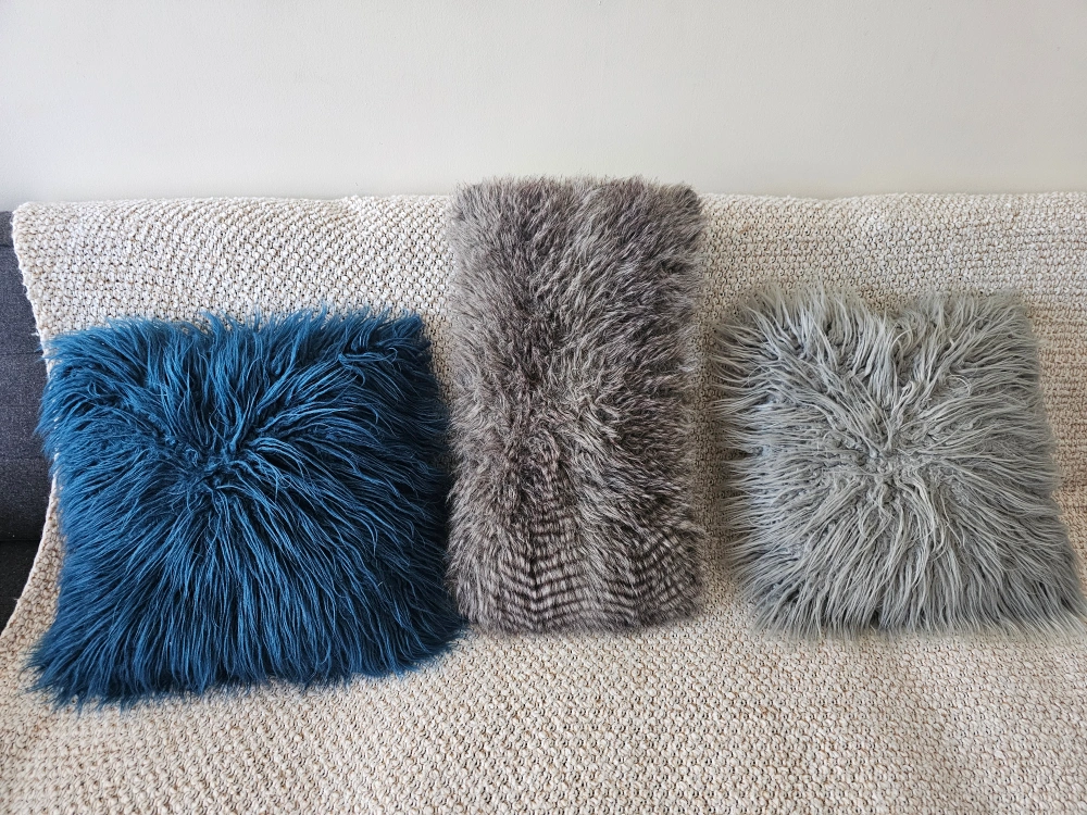 Selling a set of three faux fur throw pillows! They add a cozy and stylish touch to any living space. The set includes one blue, one grey, and one grey/brown pillow. Perfect for adding some texture to your couch or bed. Are machine washable.