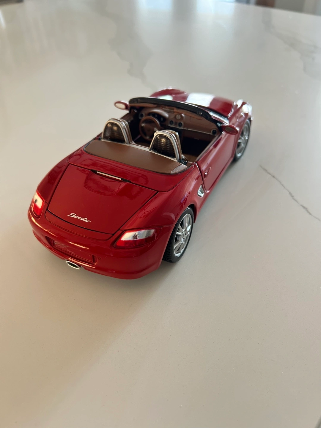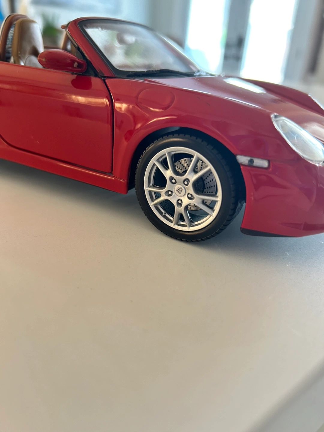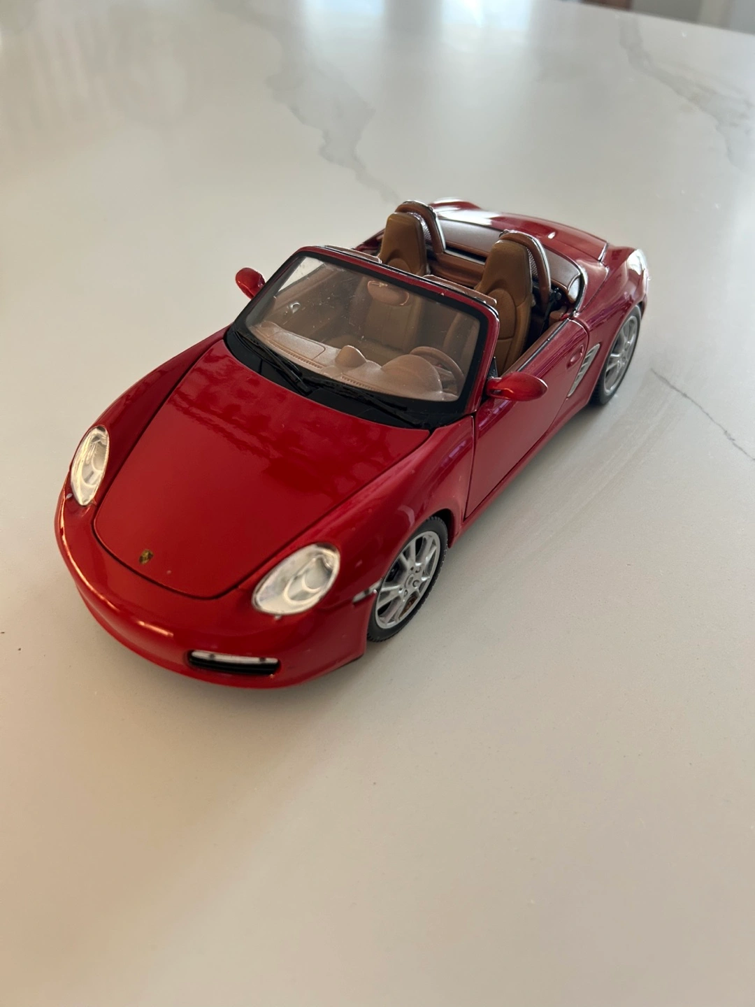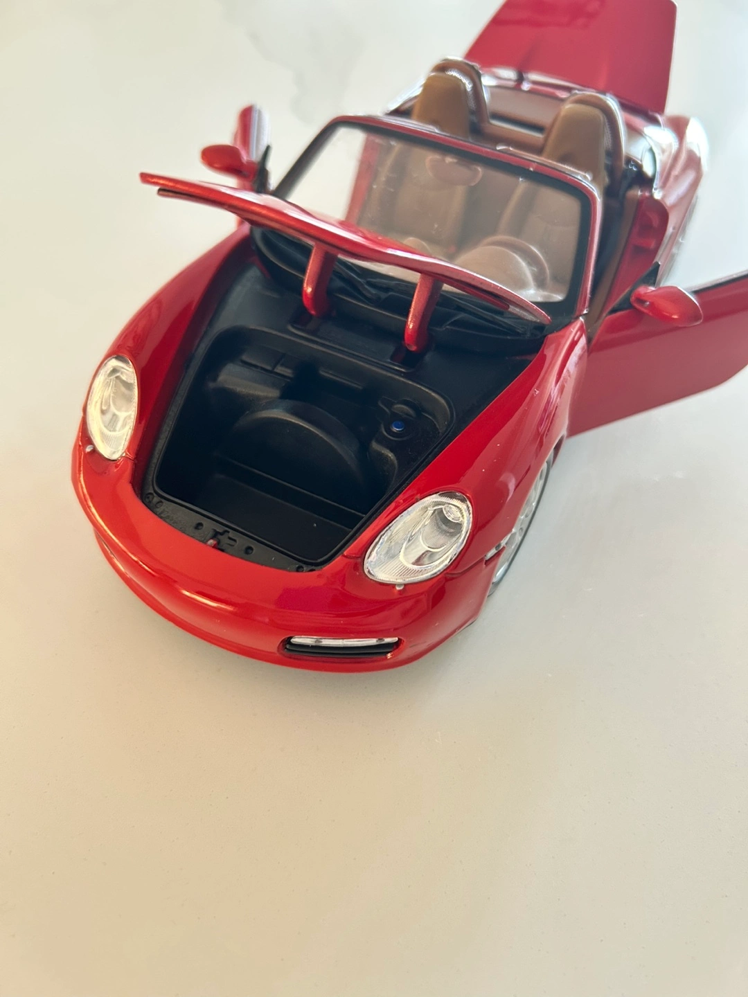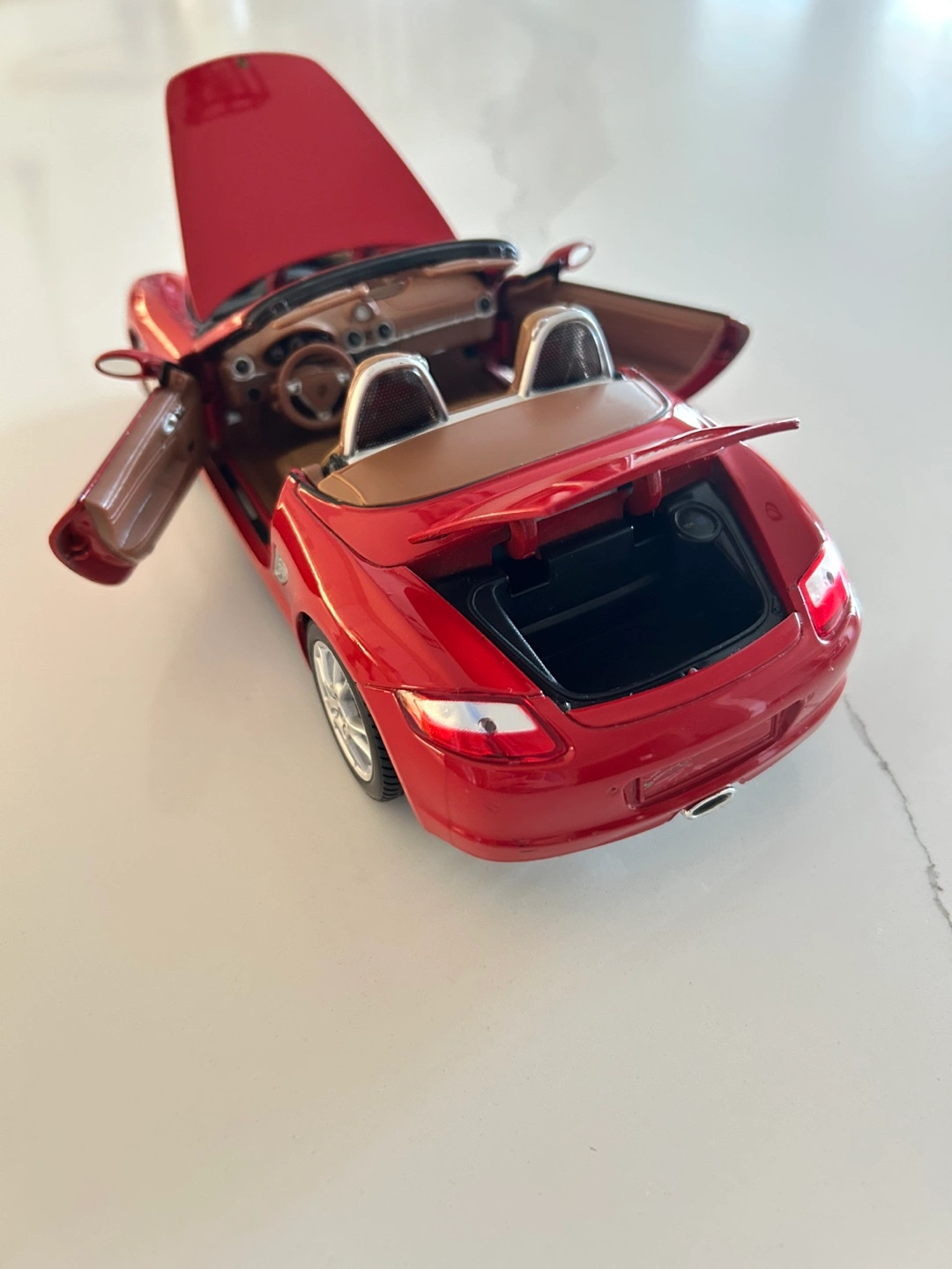 Porsche Boxster Type 987 - 1:18 Scale die cast - Fully opening trunk, hood and doors - Steering wheel can move the tires - Has suspension Note: There are a few scratches and marks on the car, I have tried to show them as best as possible. The windshield is also scratched up which I have shown in an image. The driver side door is a bit challenging to open and close.