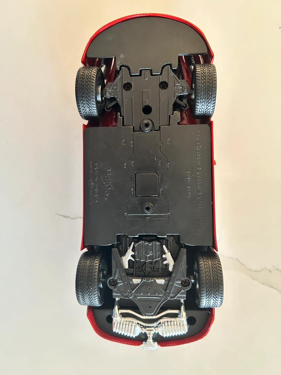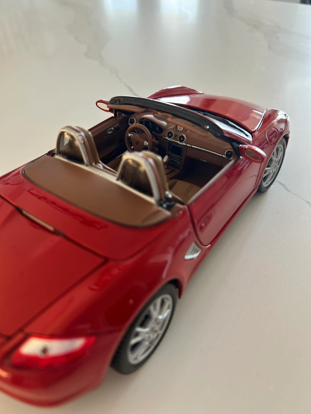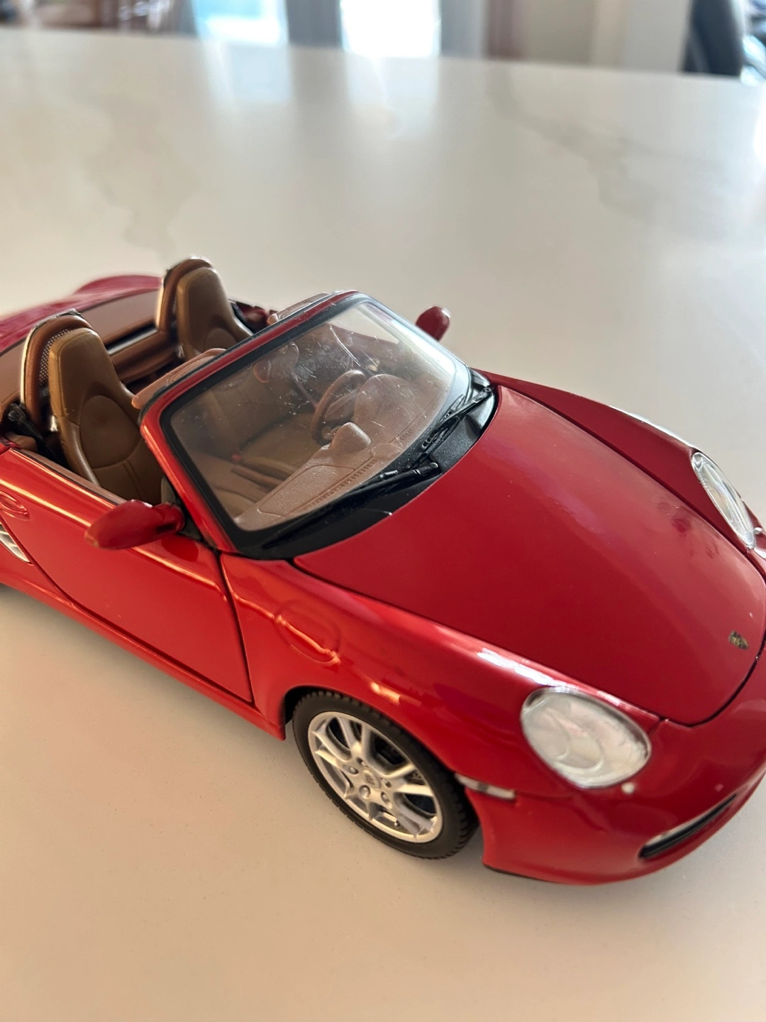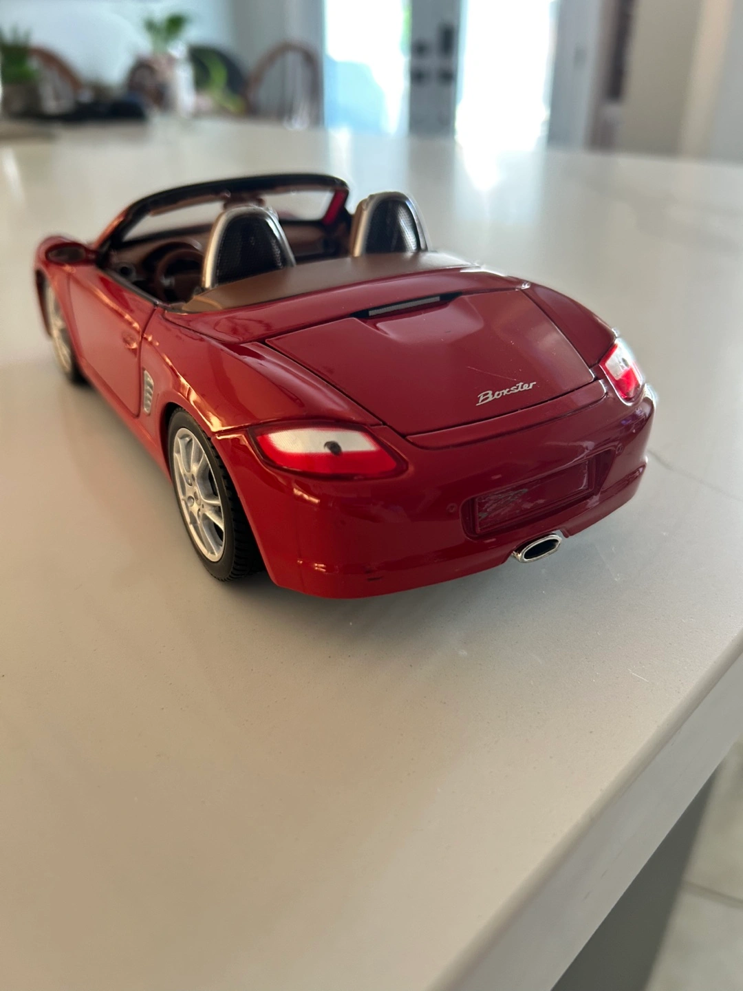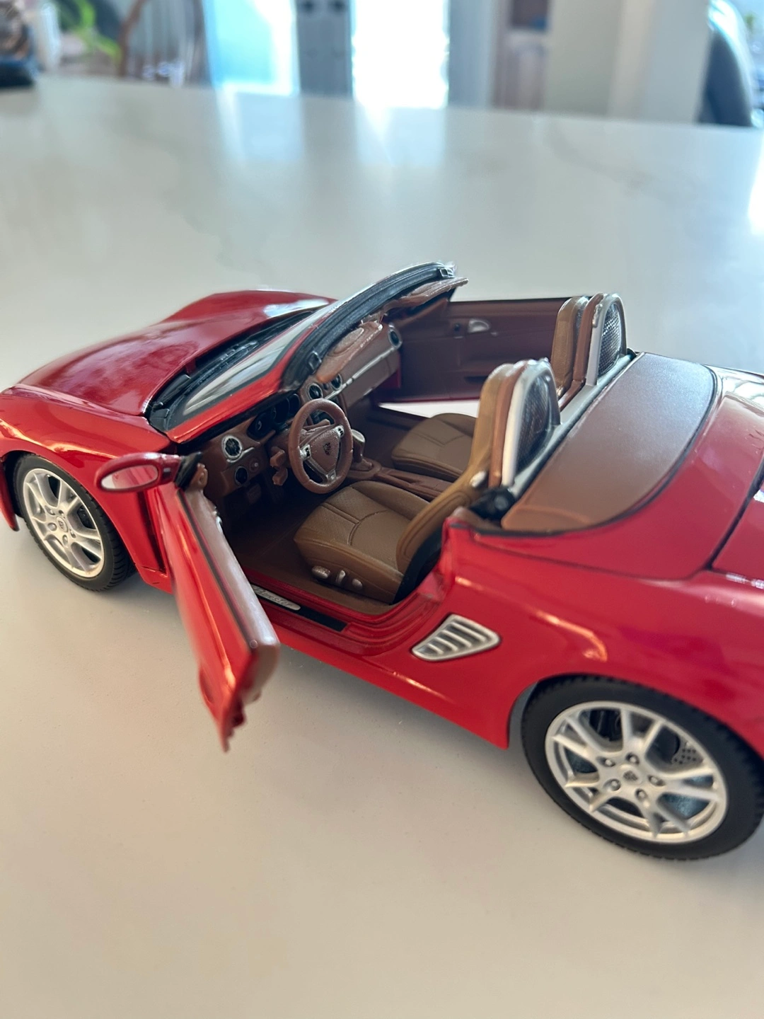 Porsche Boxster Type 987 - 1:18 Scale die cast - Fully opening trunk, hood and doors - Steering wheel can move the tires - Has suspension Note: There are a few scratches and marks on the car, I have tried to show them as best as possible. The windshield is also scratched up which I have shown in an image. The driver side door is a bit challenging to open and close.