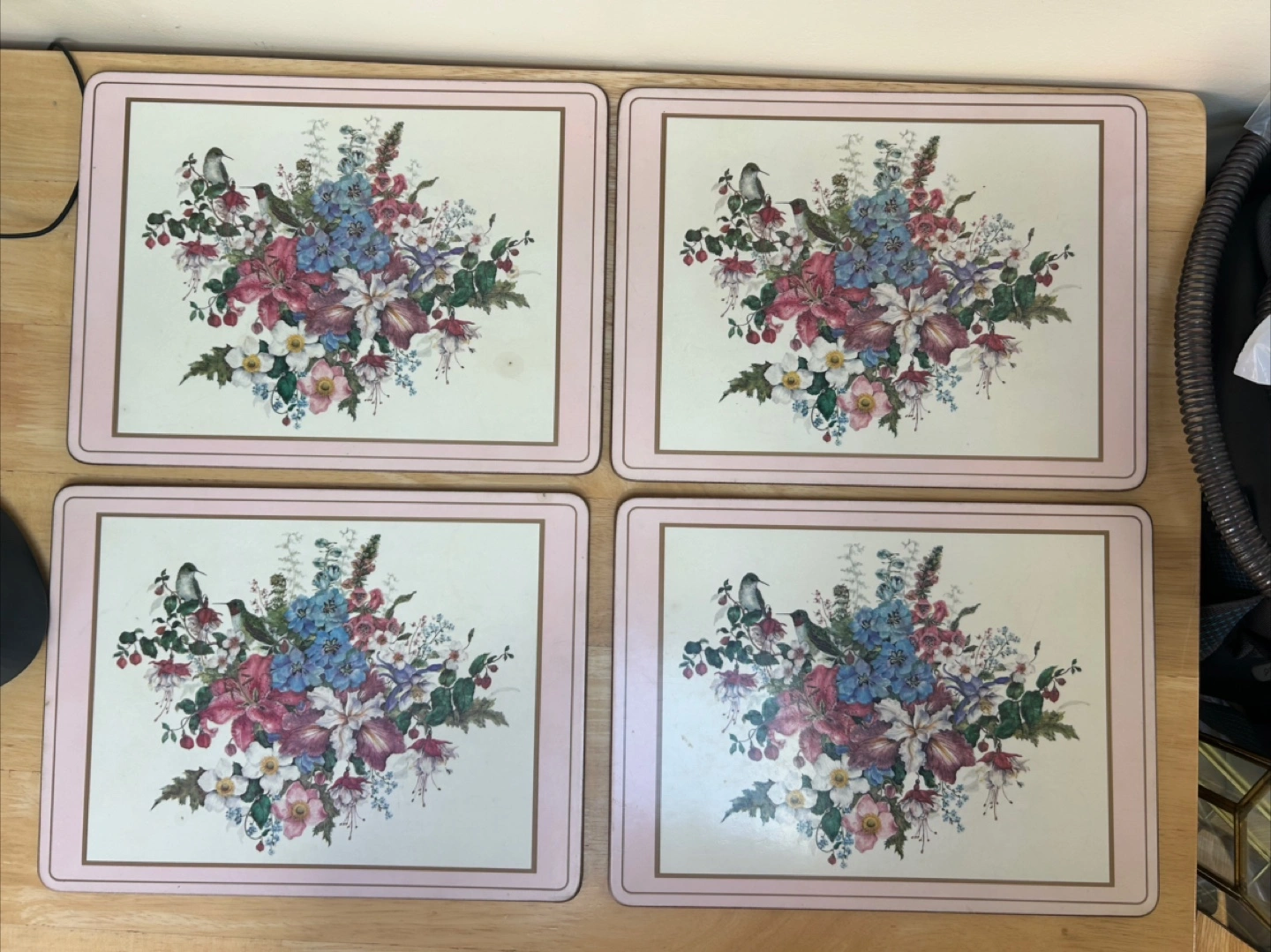 Selling a set of 4 Pimpernel placemats. They come in the original box. These placemats resist all reasonable food and beverage stains and can withstand heat of 100°C/212°F. Just clean with a moist cloth!