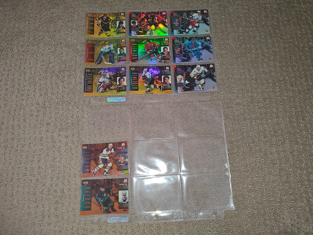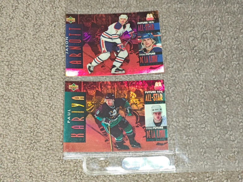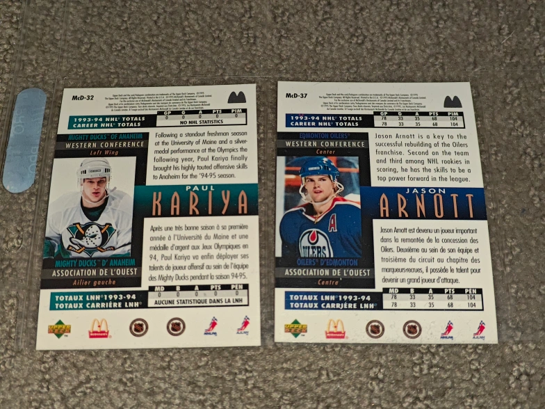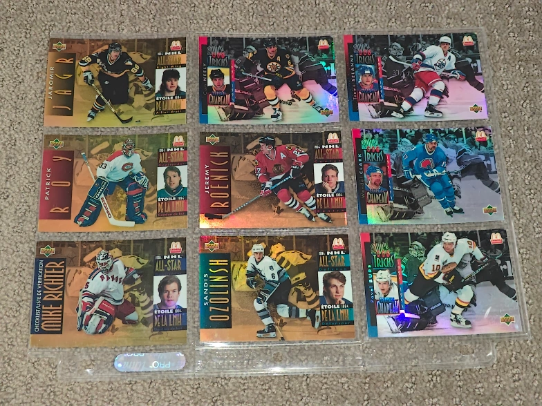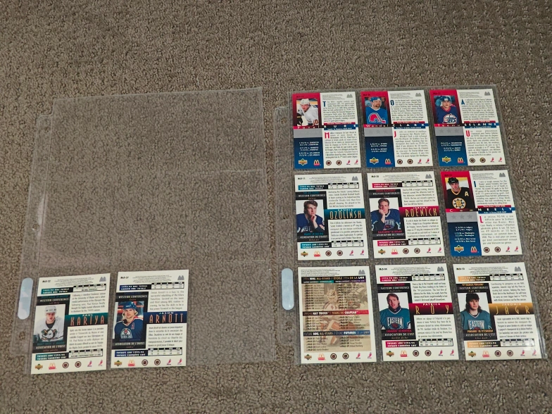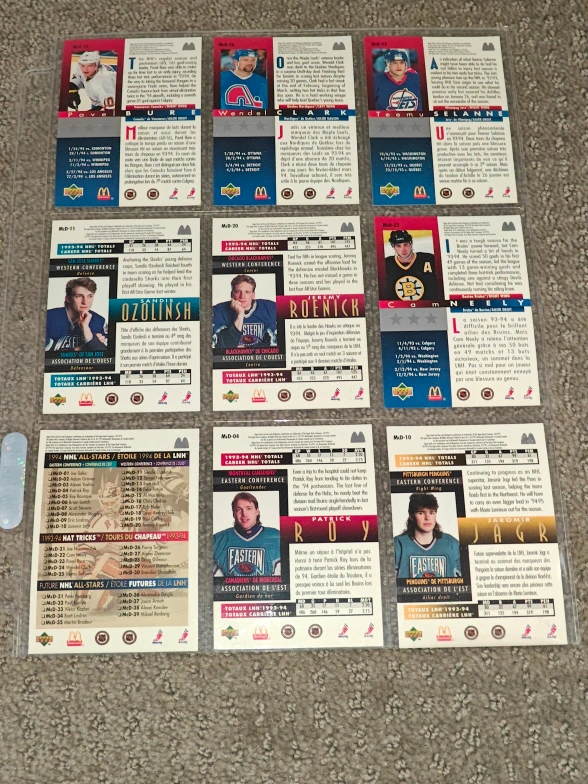 NOTE 1: This is NOT a complete set, please see below for the cards included. I am selling a Partial 1994-1995 McDonald's Upper Deck Hockey Trading Card in excellent, like-new condition. Includes: * 2 - Ultra ProTrading Card Sleeves * 1 - Checklist - Richter * McD-04 - Roy * McD-10 - Jagr * McD-11 - Ozolinsh * McD-20 - Roenick * McD-22 - Neely * McD-23 - Bure * McD-24 - Clark * McD-25 - Selanne * McD-32 - Kariya * McD-37 - Arnott Comes from a pet and smoke-free environment. Pickup in Mount Pleasant (NW Calgary)