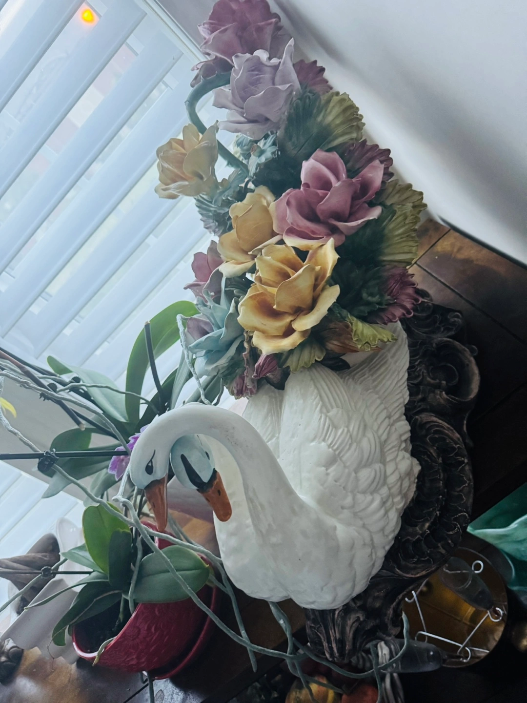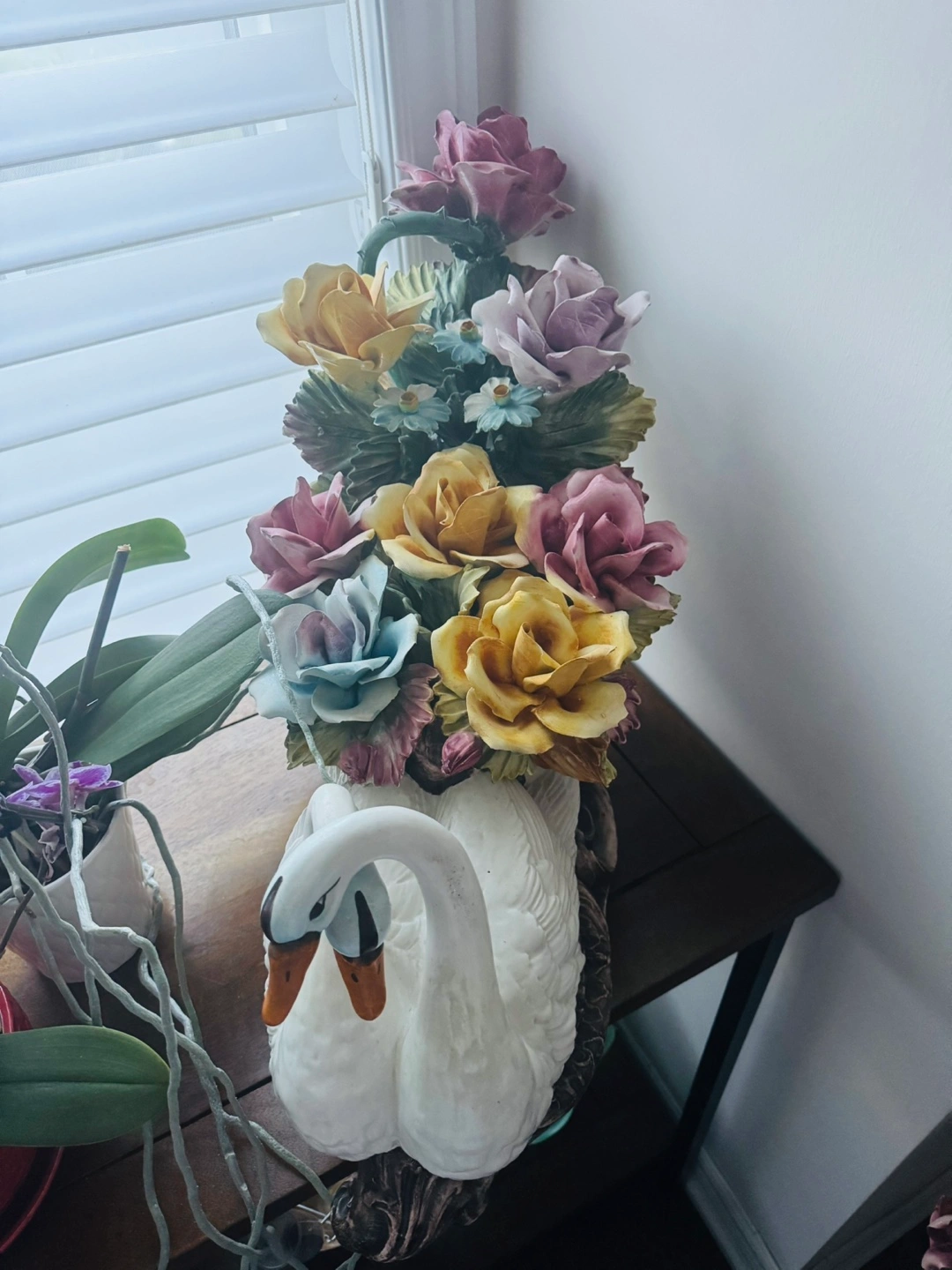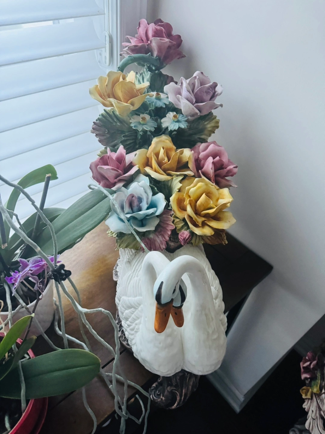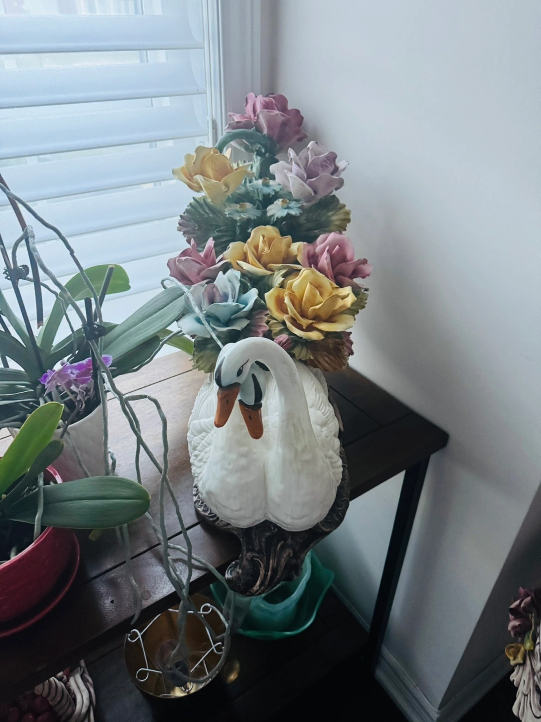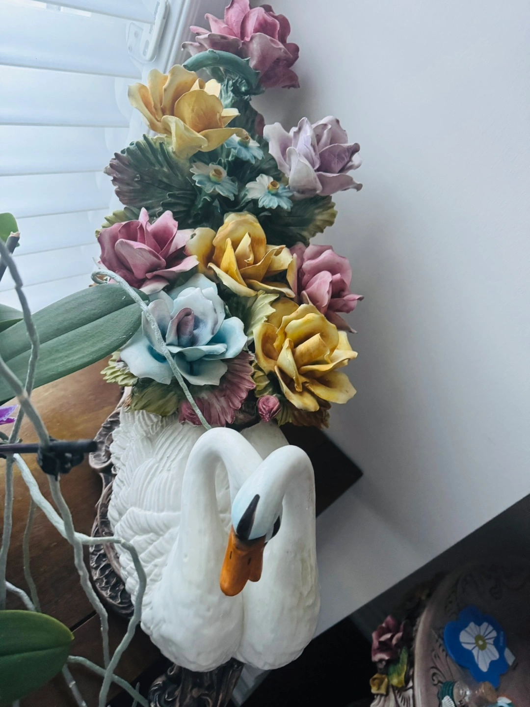 This is a lovely swan figurine with a floral Capodimonte Italian made arrangement. It features a pair of swans at the base with a variety of colourful roses and other flowers cascading upwards. It would make a beautiful addition to any home decor