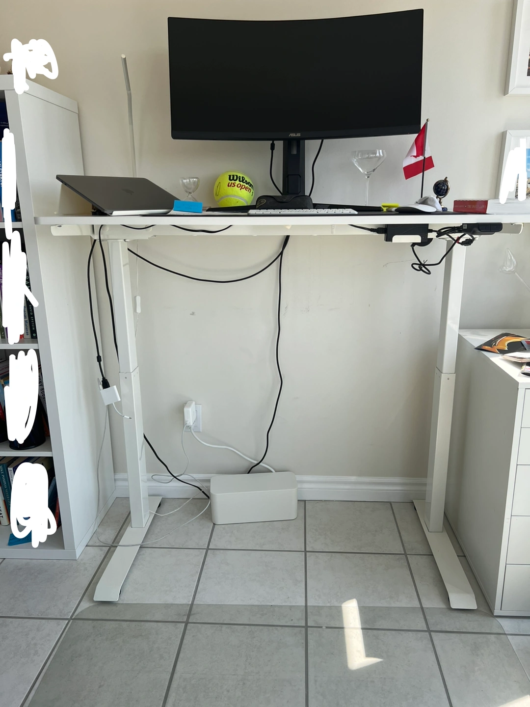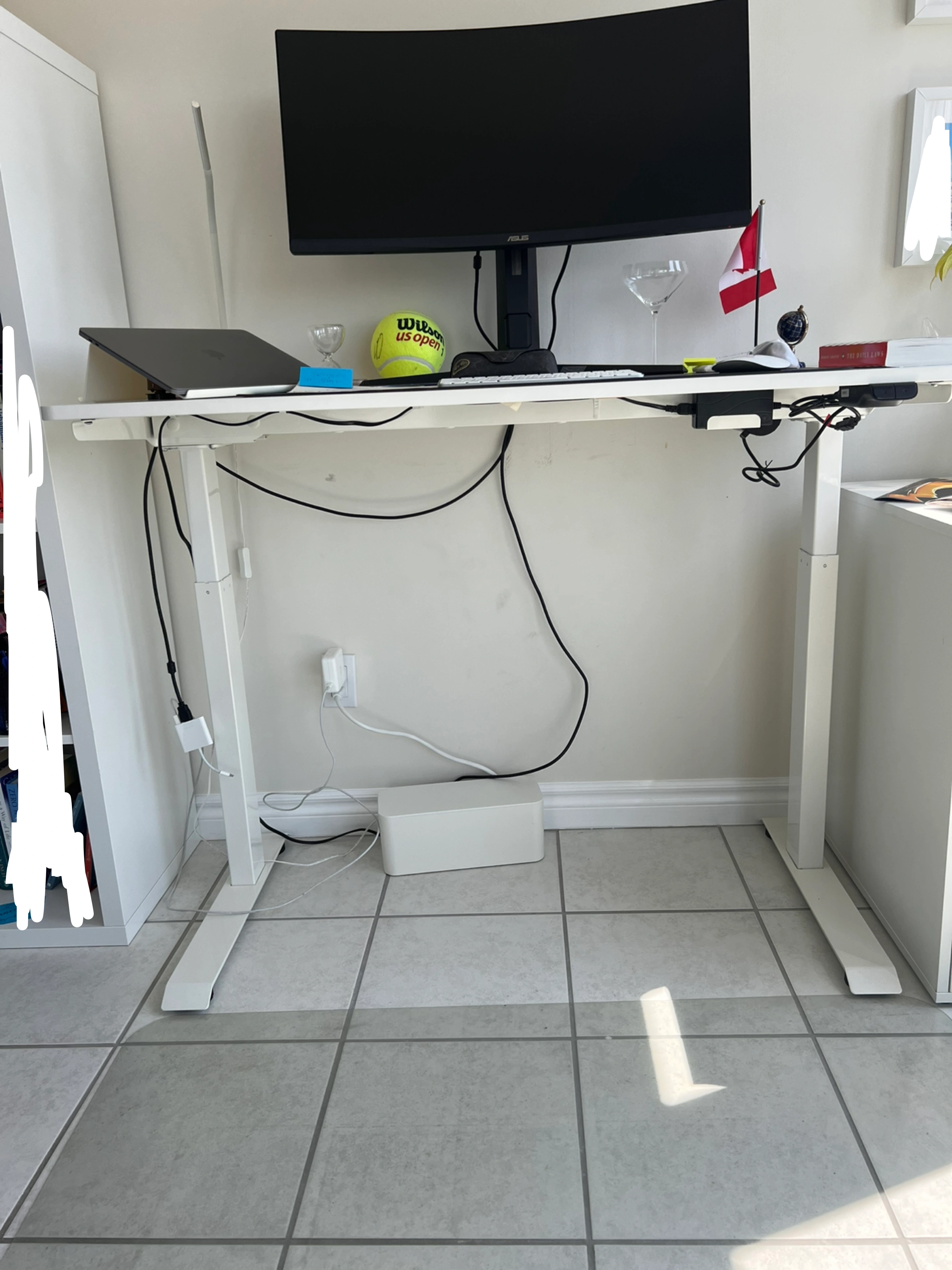 Selling a white adjustable electric standing desk. It's in great shape and ready for a new home. Perfect for setting up a home office! Has had the black protective cover since day 1. Measures 47.5 inches in length π΅ Cash only pls!! Pet/smoke/child free home. π¨ Part of our move-out sale β check my other listings for more great finds!