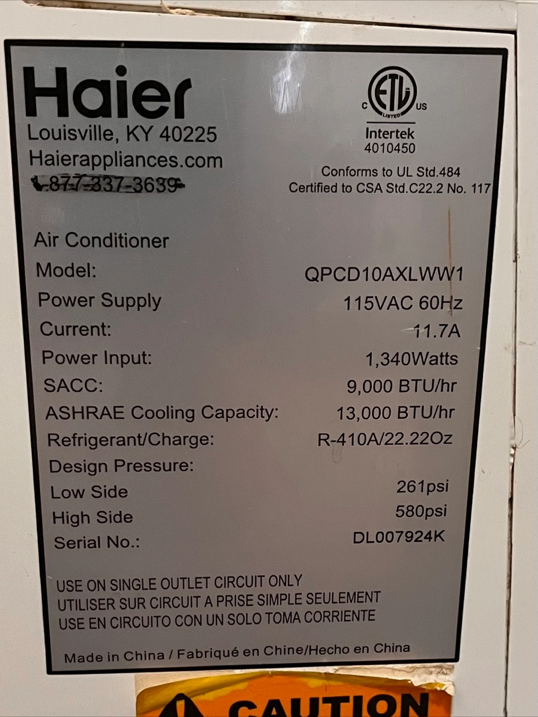 Selling a Haier portable air conditioner. It's in great condition and ready to keep you cool this summer! - Model: QPC10AXLWW1 - Power Supply: 115VAC 60Hz - Power Input: 1,340 Watts - SACC: 9,000 BTU/hr - ASHRAE Cooling Capacity: 13,000 BTU/hr - Refrigerant/Charge: R-410A/22.20z Sold as is