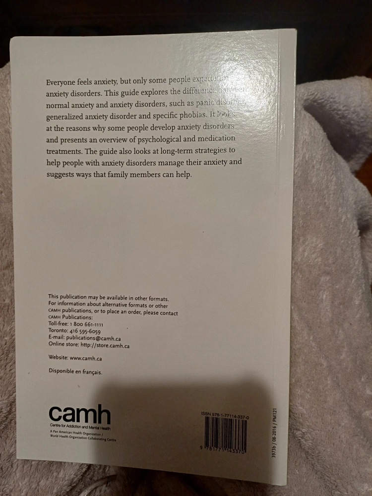 Free: helpful information guide on anxiety disorders published by CAMH (Centre for Addiction and Mental Health). It covers a range of topics from understanding anxiety to treatments and support for families. Great resource for anyone looking to learn more about anxiety!