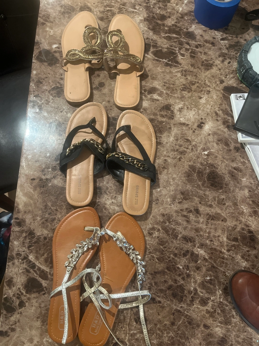 Selling a bundle of sandals! Includes a pair of Call It Spring black sandals with gold chain detail and a pair of H&D Moda Española sandals with silver straps and rhinestone detail so.e Womens 10 All 3 pair 5.00 shipping avalible for all items flat rateof 5.00 for alldollars with tracking to your home dave gas time and able to return thanks