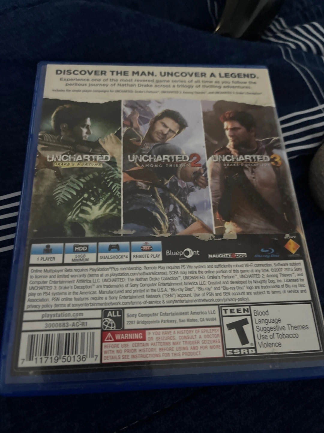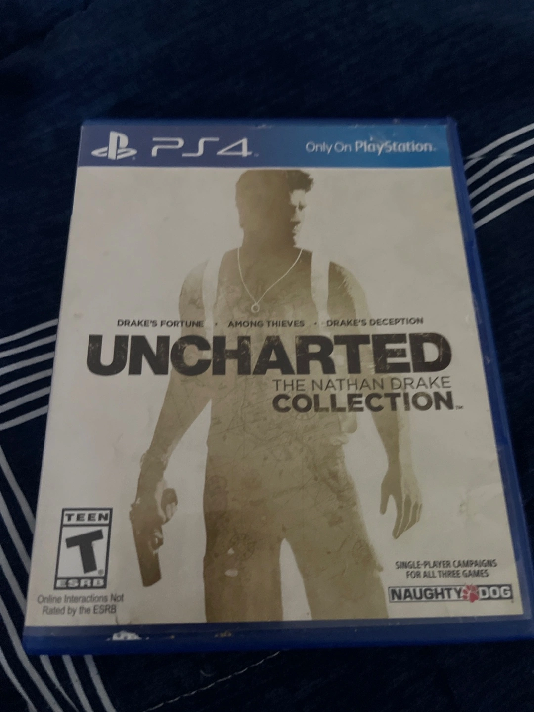 Selling Uncharted: The Nathan Drake Collection for the PlayStation 4! This includes Drake's Fortune, Among Thieves, and Drake's Deception. Enjoy the single-player campaigns for all three games in one collection. Rated T for Teen.