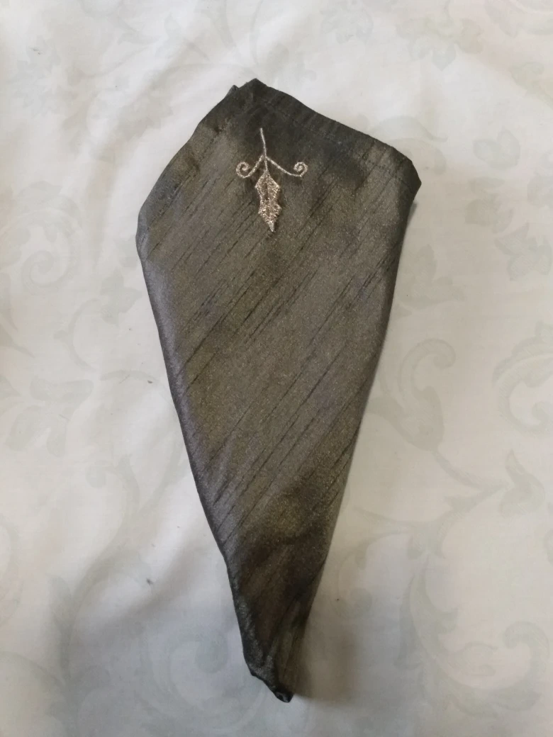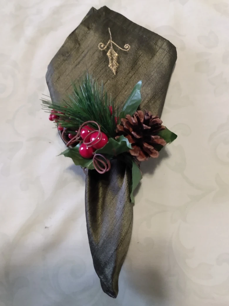 I'm selling a set of four lovely olive green napkins. They have a subtle sheen and delicate embroidery in the corner. These would be perfect for adding a touch of elegance to your dining table!