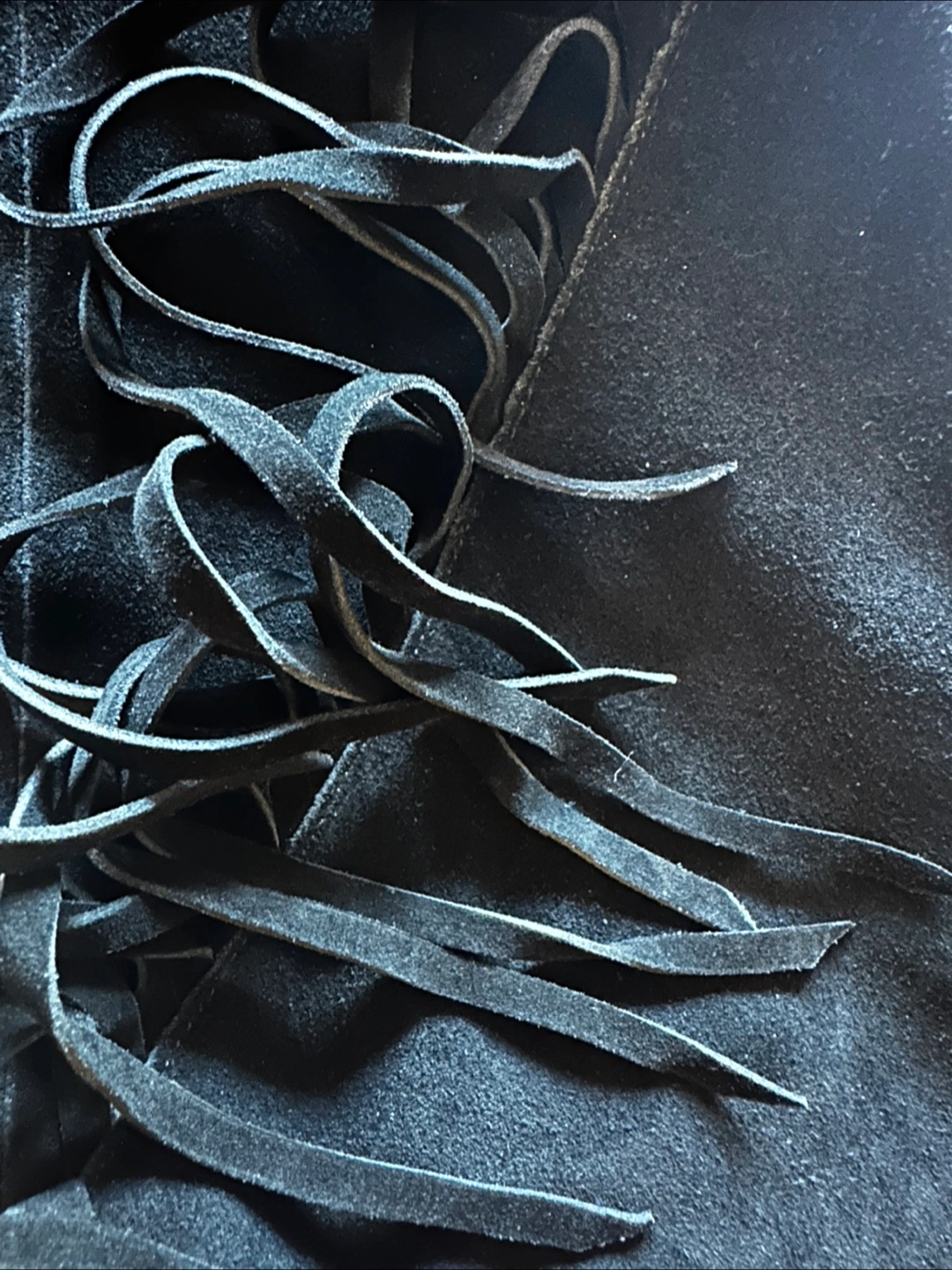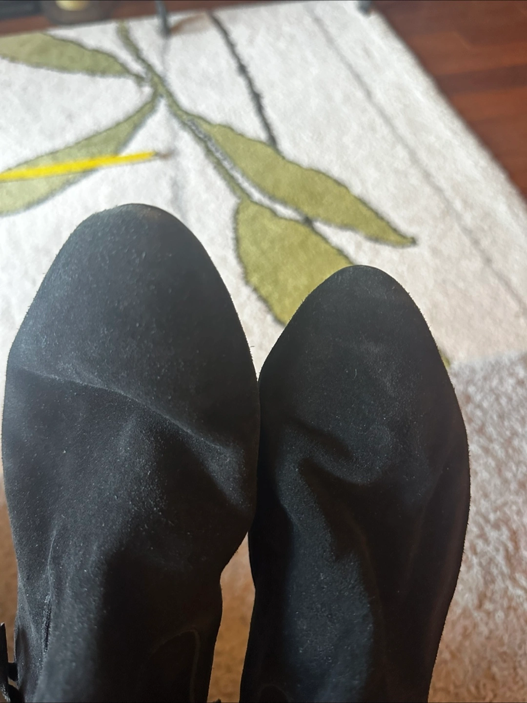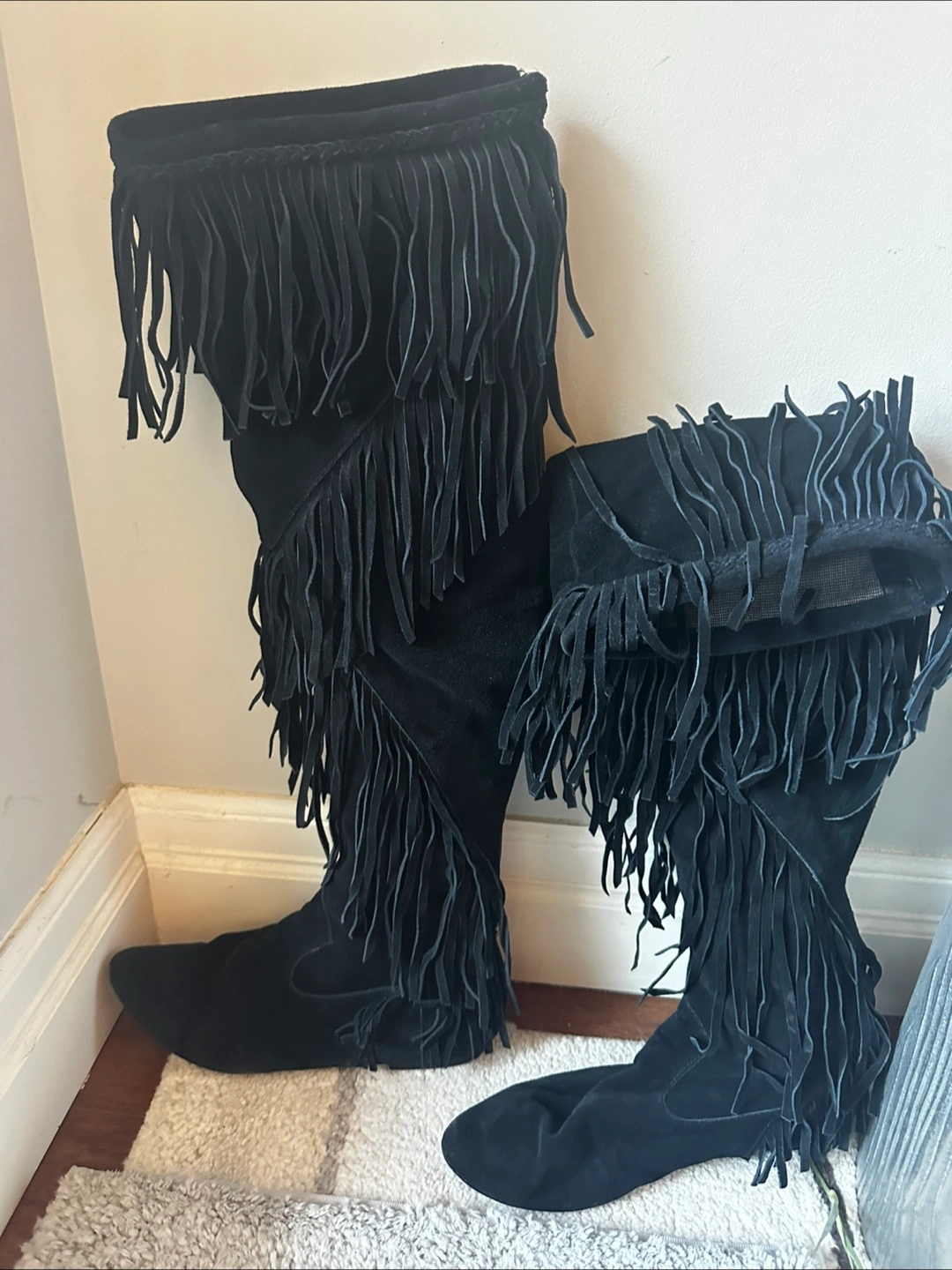 Above the knee statement boots. Only worn a very few times. 24” high, circumference at the top is 16”. Size marked as 9.5, but my size 10 feet fit into them snugly. Smoke-free, pet-free home.