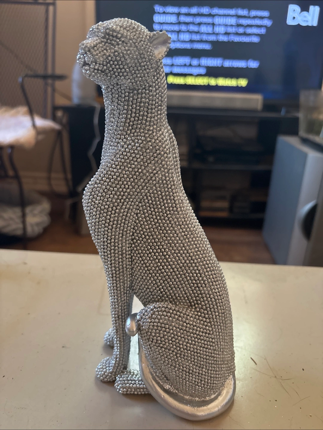 Selling a silver leopard statue. It's a really cool piece that would look great in any home. The statue is in good condition and has a nice, glimmery, beaded finish.