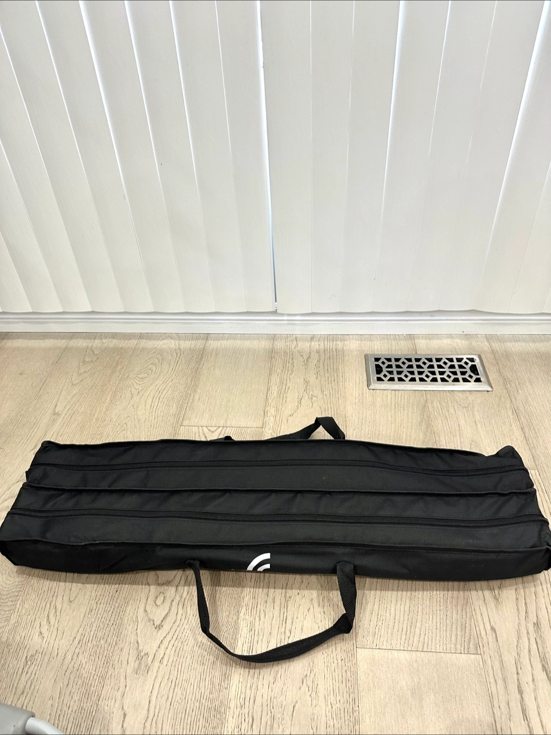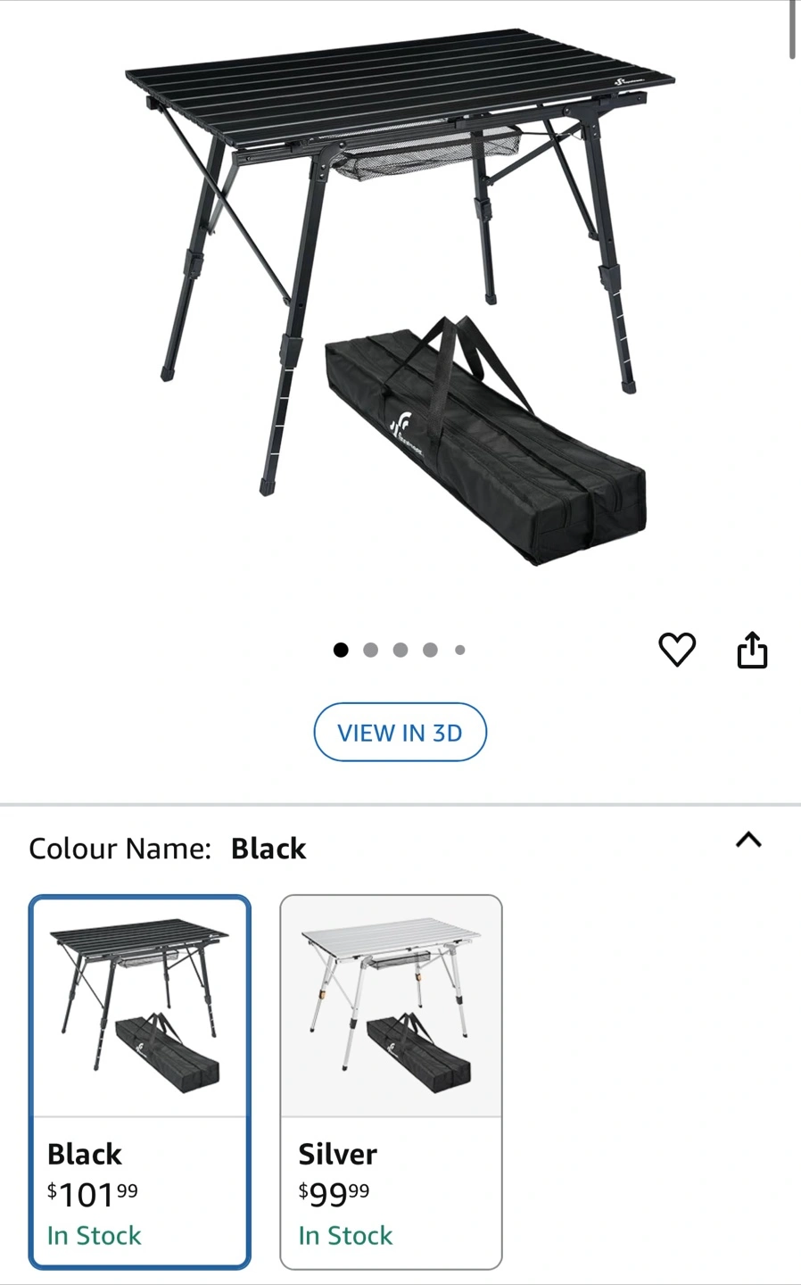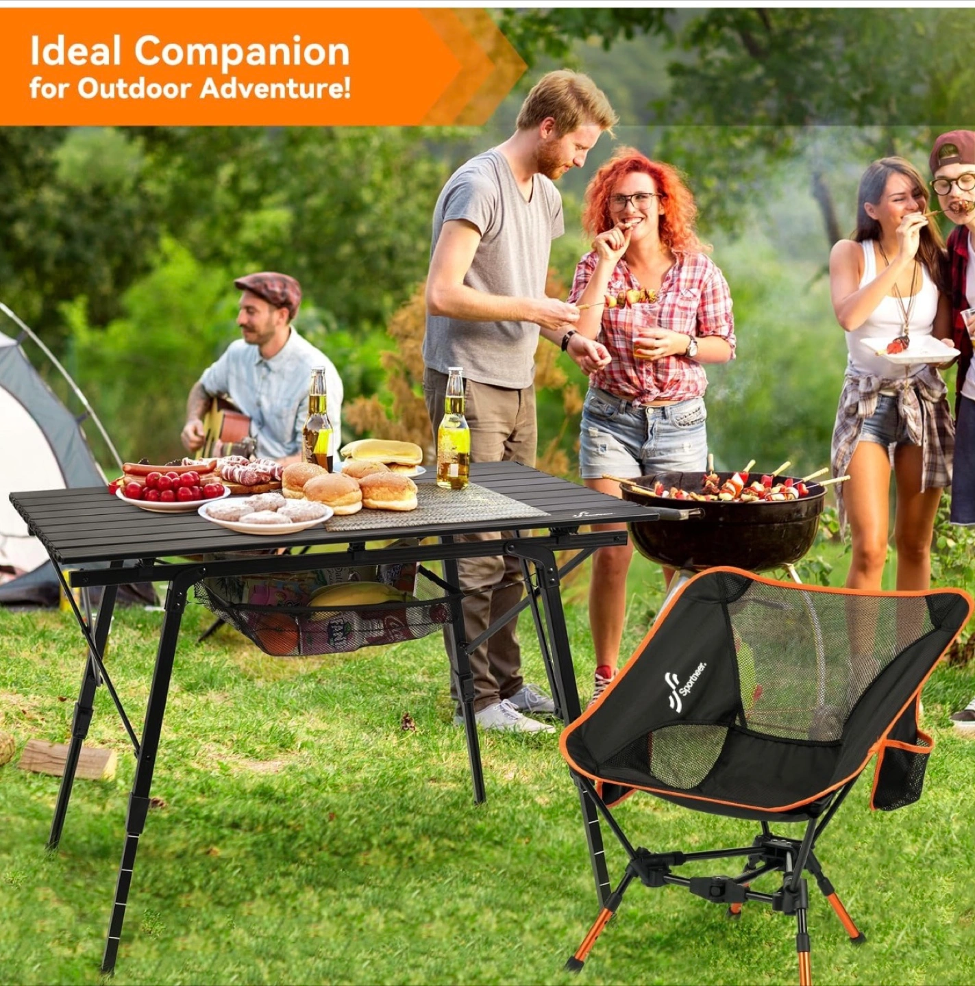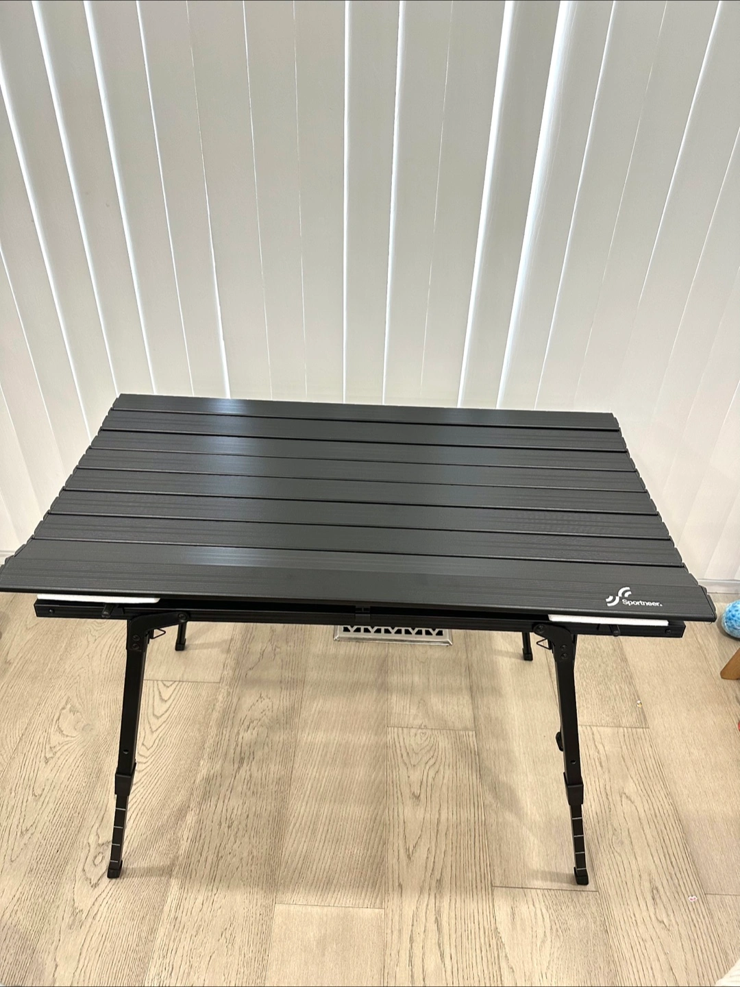 This Sportneer camping table is perfect for outdoor adventures! It's black, adjustable, and comes with a convenient storage bag. The table features a quality roll-up table top, a sturdy metal chain structure, and a mesh layer for extra storage space. It's durable and stable, making it an ideal companion for camping, picnics, or any outdoor activity. Originally bought for $101.99