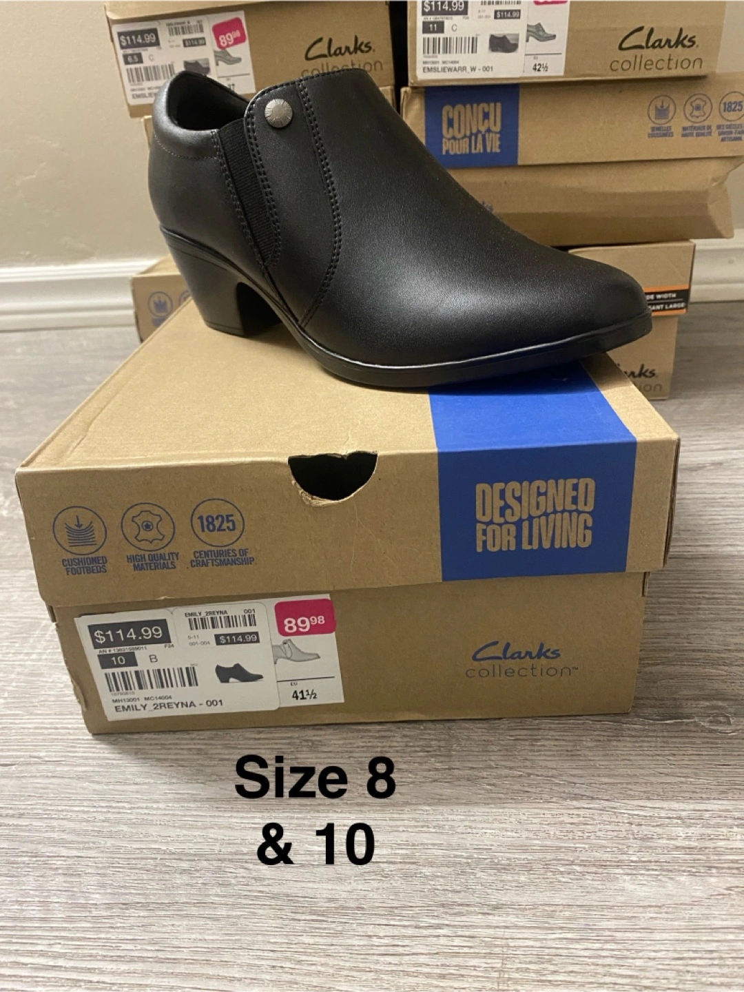 I have a pair of Clarks Emily 2 Reyna ankle boots in black leather. The box says they have cushioned footbeds and are made with high-quality materials. The original price was $114.99. It is brand new in original box.
