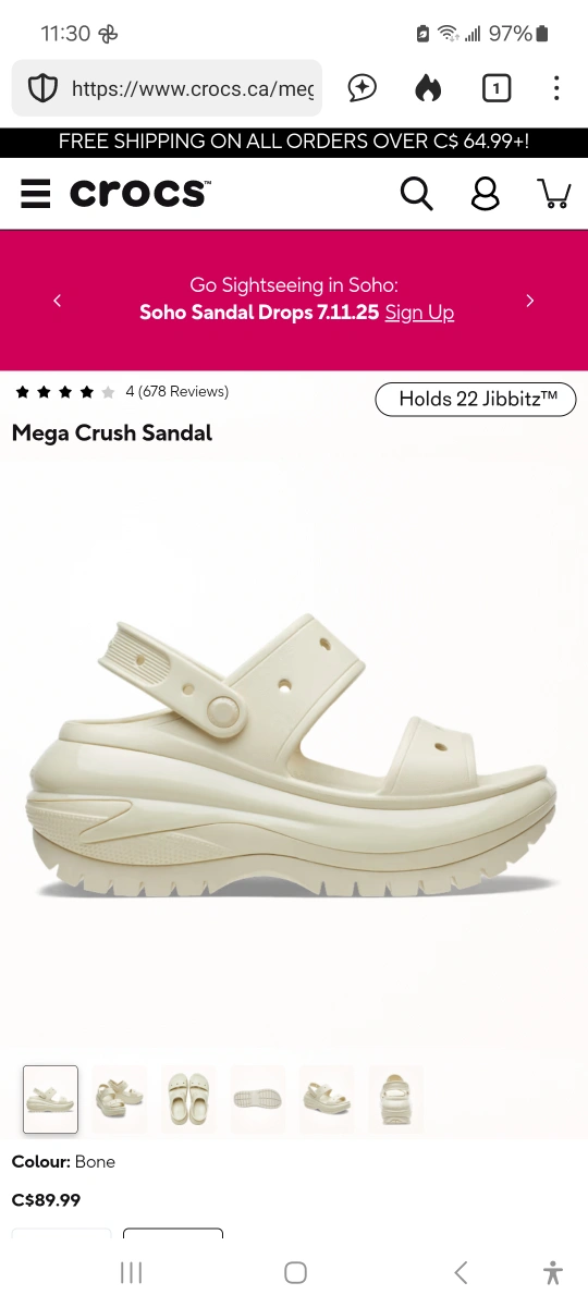 Selling a pair of Crocs Mega Crush Sandals in the bone colour. They're super comfy and stylish! These sandals hold 22 Jibbitz so you can customize them to your liking. Priced at $89.99 on the site. Worn once. https://www.crocs.ca/mega-crush-sandal/207989,en_CA,pd.html?cid=2Y2 Can meet on Bloor line from Ossington to Main Street and Yonge/University line downtown. Available late morning to early afternoon on the weekends, and occasionally in the evening after work during the week. Pickup available.
