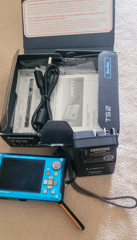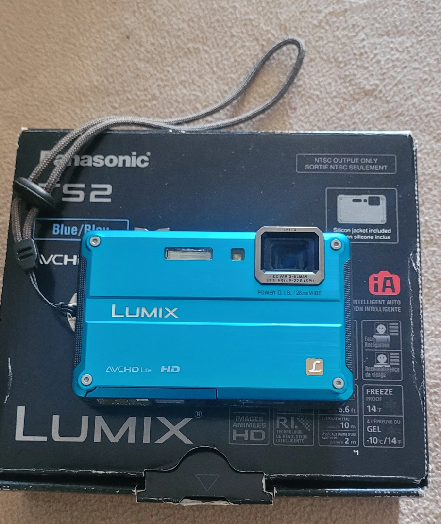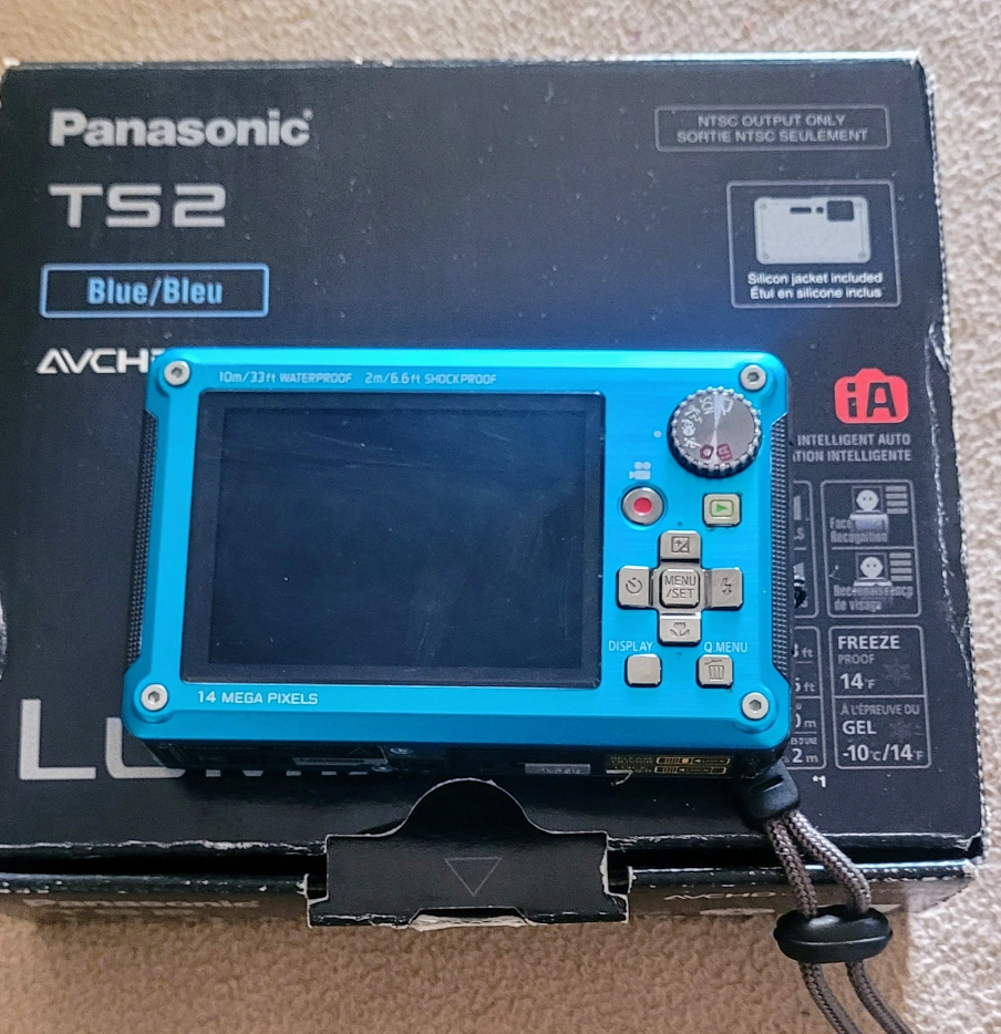 I'm selling a used Panasonic Lumix DMC-TS2 digital camera, known for its rugged design and waterproof capabilities, along with its 14.1-megapixel sensor for clear, vibrant photos. This camera is perfect for adventurous photographers who need a reliable and durable device. It comes complete with its original box, charger, and battery. Although it shows signs of use, it functions perfectly and is ready for its next adventure! Here are some of its key features: * 14.1-megapixel sensor * 4.6x optical zoom with a 28mm wide-angle lens * Waterproof up to 33 feet * Shockproof up to 6.6 feet * Records 720p HD video * Intelligent Auto (iA) mode for easy shootig. Just a heads-up: if you're seeing this ad, the camera is still available!