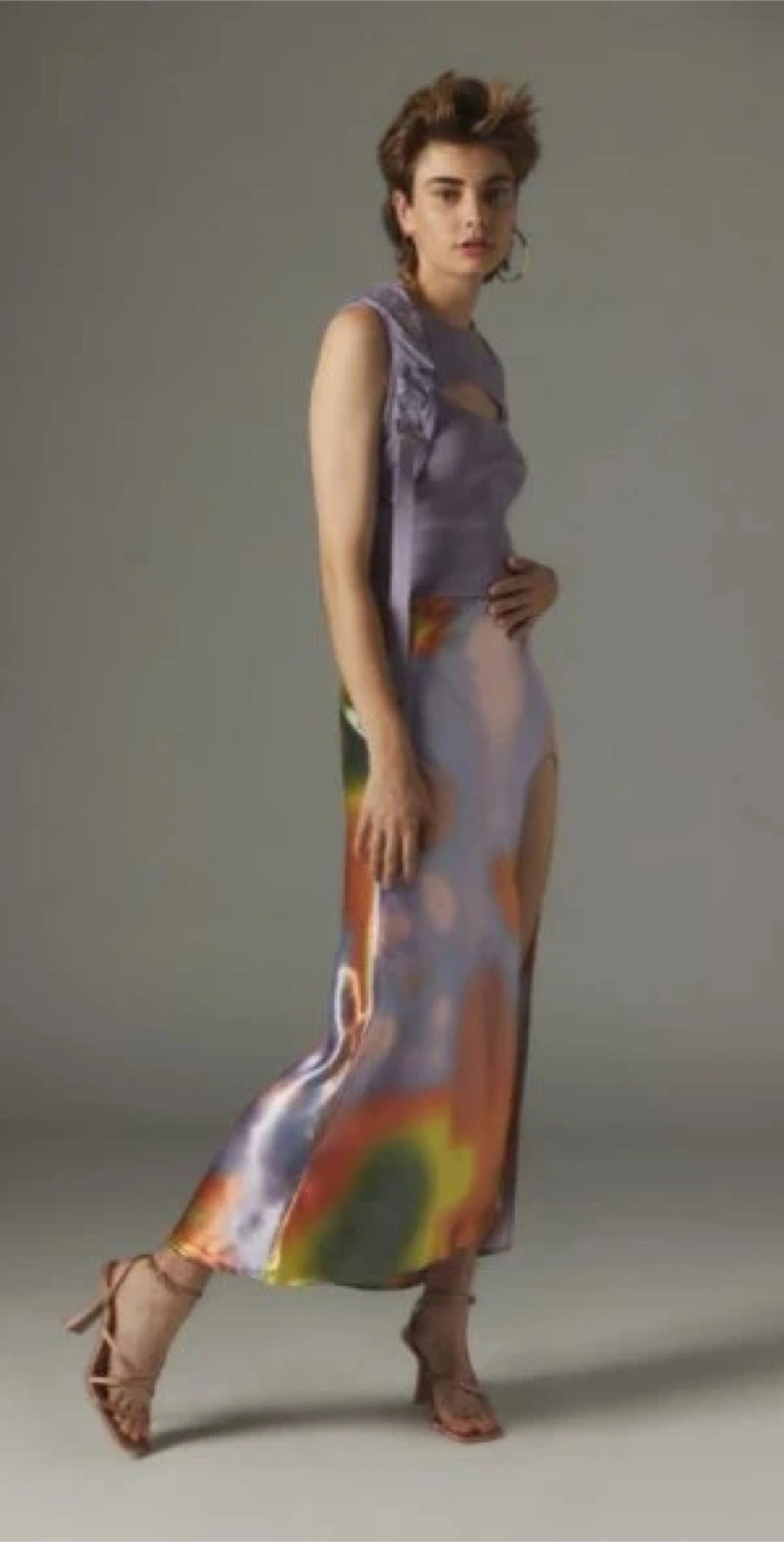 Couldn’t find the stock photo but it’s the SOLIS halter top! The iridescent fabric shifts colours beautifully in the light. Good/Okay condition.