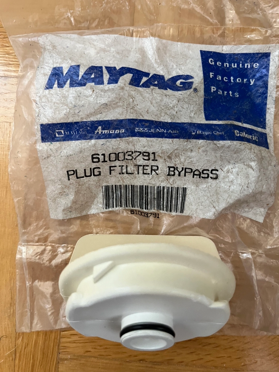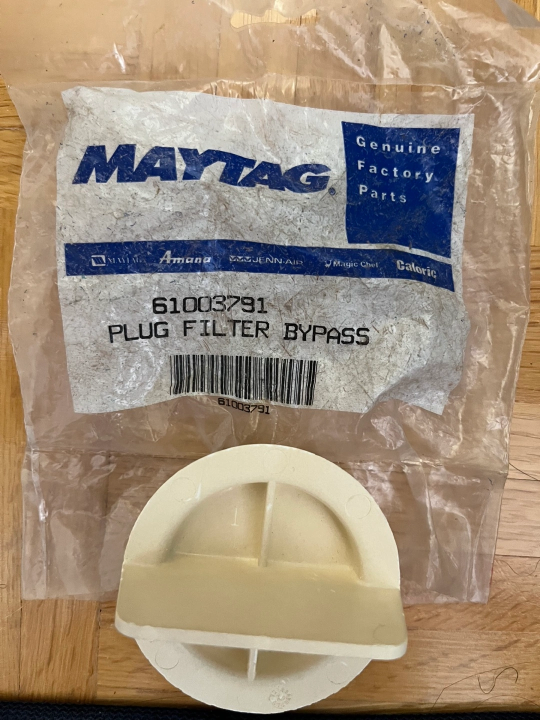 Selling a new Maytag 61003791 Plug Filter Bypass. This is a genuine factory part and comes in its original packaging