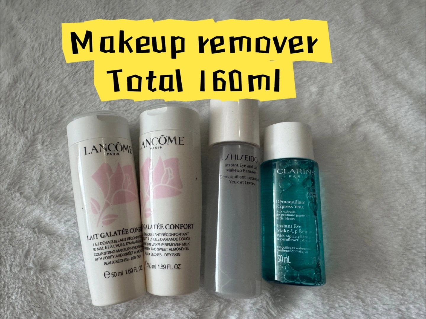 Selling a set of makeup removers including Lancôme Lait Galatée Confort (50ml), Shiseido Instant Eye and Lip Makeup Remover, and Clarins Démaquillant Express Yeux (30ml). Total volume is 160ml