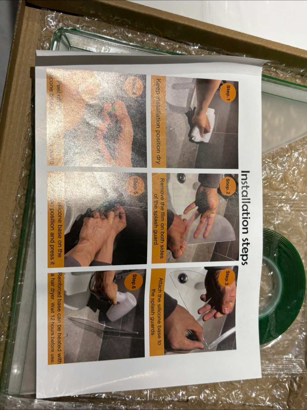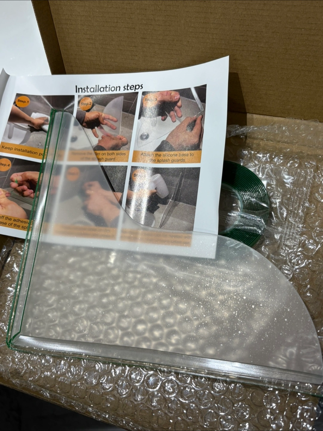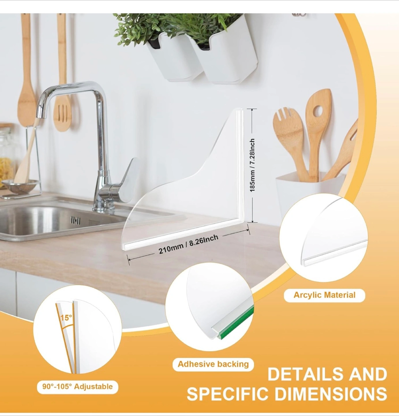 Selling a brand new clear acrylic kitchen sink splash guard! It came with two and I only needed one piece. It's designed to prevent water from splashing behind your sink. The dimensions are 185mm / 7.28 inches in height and 210mm / 8.26 inches in length. It's adjustable from 90 to 105 degrees and made of durable acrylic material. Easy to install with adhesive backing, and installation steps are included! Comes with adhesive.