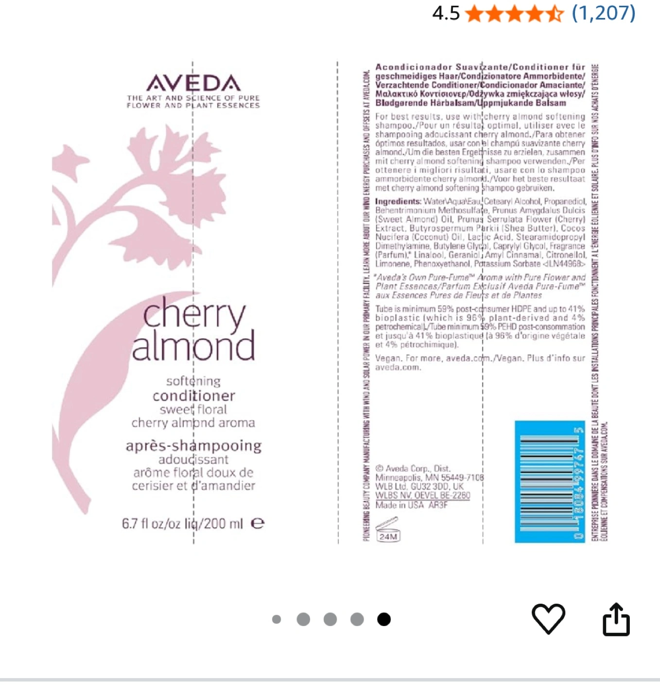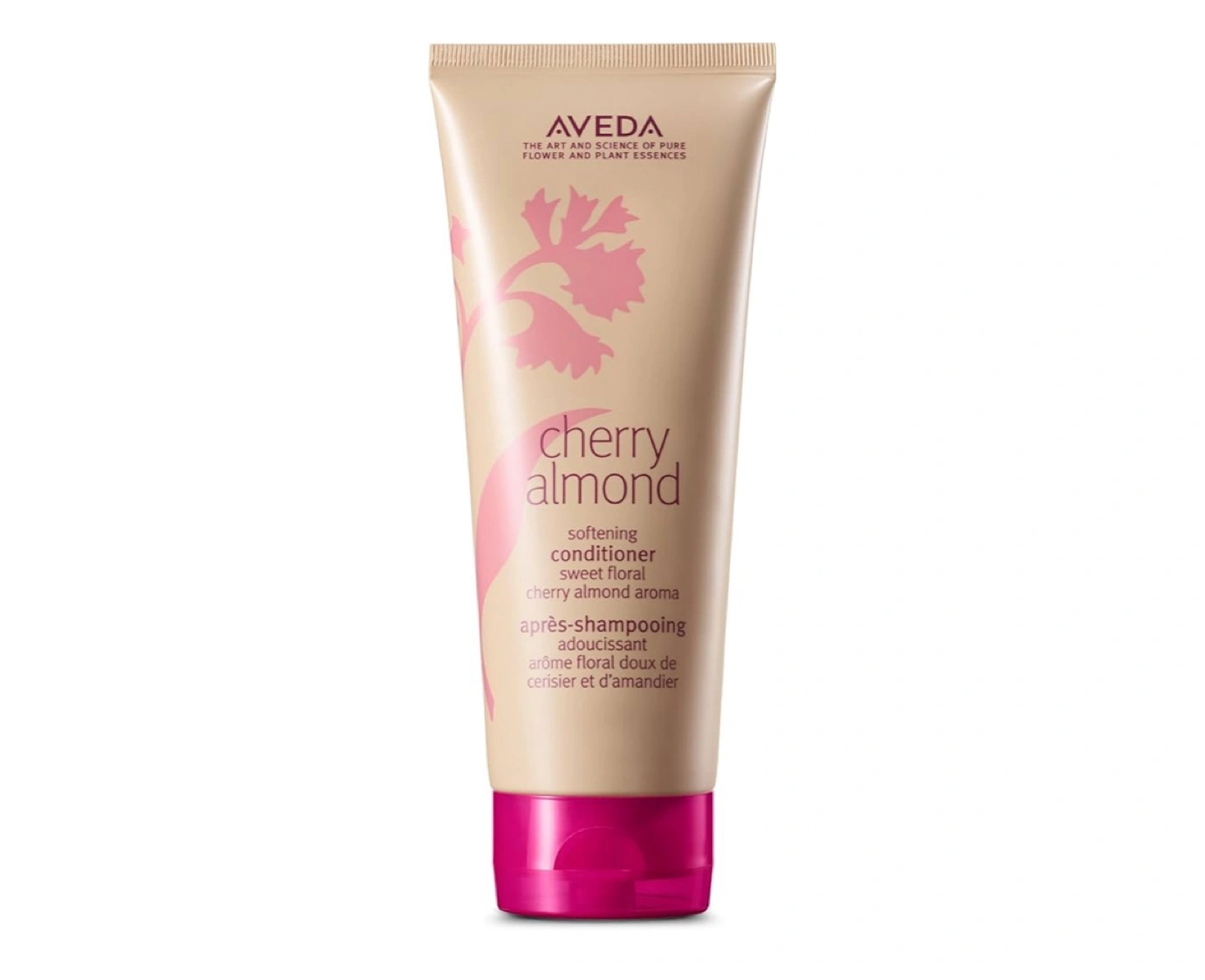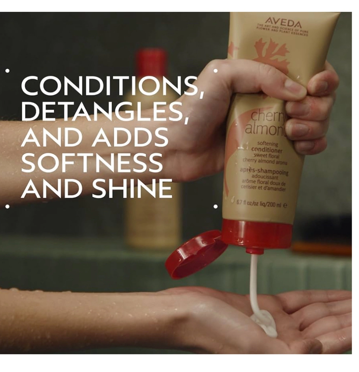 Here's an Aveda Cherry Almond softening conditioner! It's a sweet floral cherry almond aroma après-shampooing. The size is 6.7 fl oz/oz liq/200 ml e.